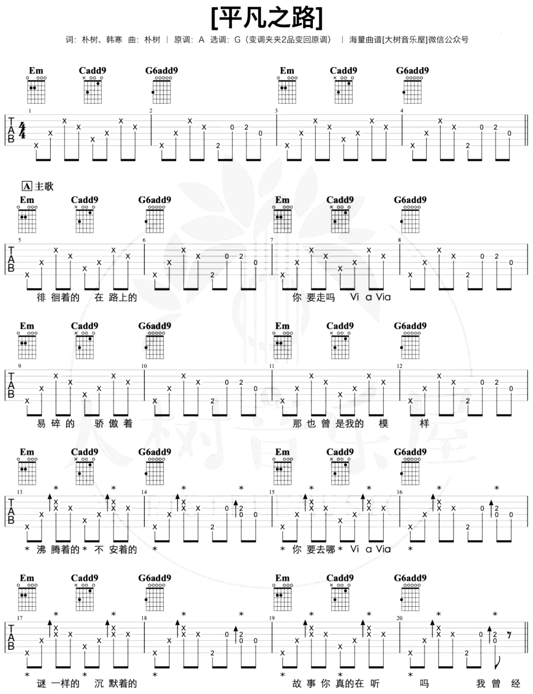 《平凡之路》吉他弹唱演示和教学视频,含指弹打板技巧。曲谱原调A选调G,变调夹夹第二品回原调,两张图片六线谱。