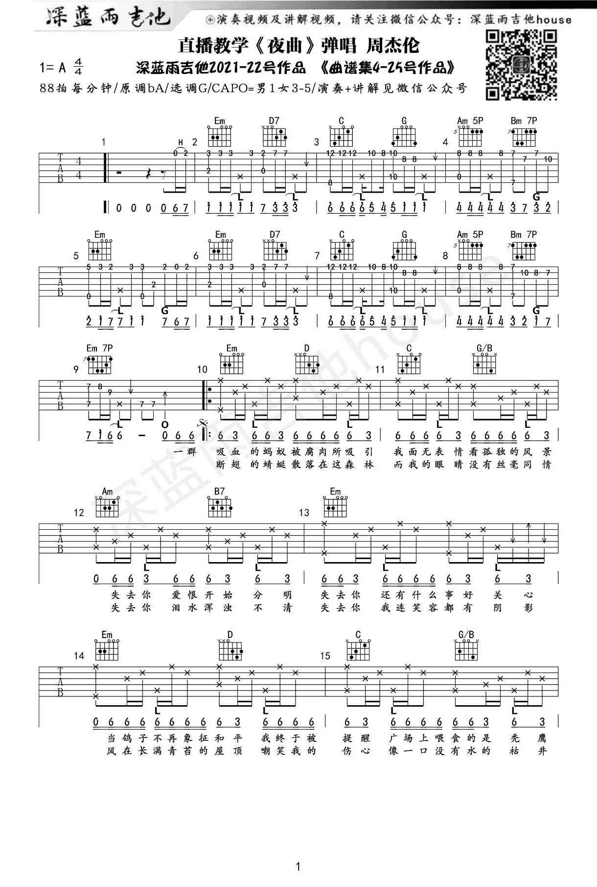 周杰伦的一首经典情歌作品,夜曲吉他谱,原调降A,选调G,变调夹推荐,男1女3-5品,随谱附上深蓝雨吉他弹唱演示视频,完整编配三张图片谱子。没有萧邦夜曲中的柔美,周杰伦注入忧郁的情绪,在悲怆凄美的琴声中,演绎出夜的宁静和清幽。仿佛为我们打开尘封已久的爱情故事。