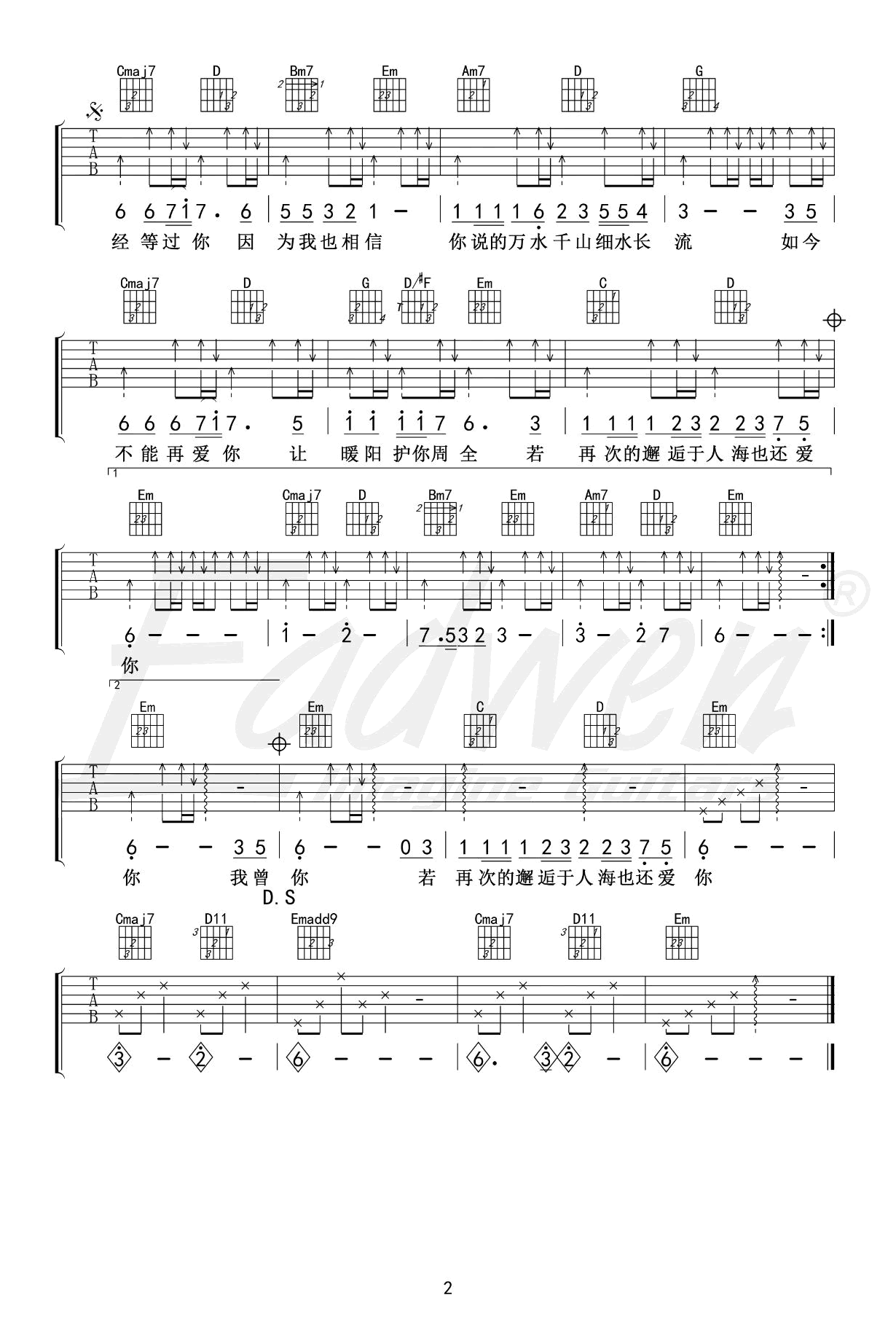 你的万水千山吉他谱,海来阿木演唱的经典浪漫情歌,《你的万水千山》吉他弹唱教学视频,曲谱选用G调指法编配,演奏速度每分钟65拍左右,六线谱共两张图片谱例。
