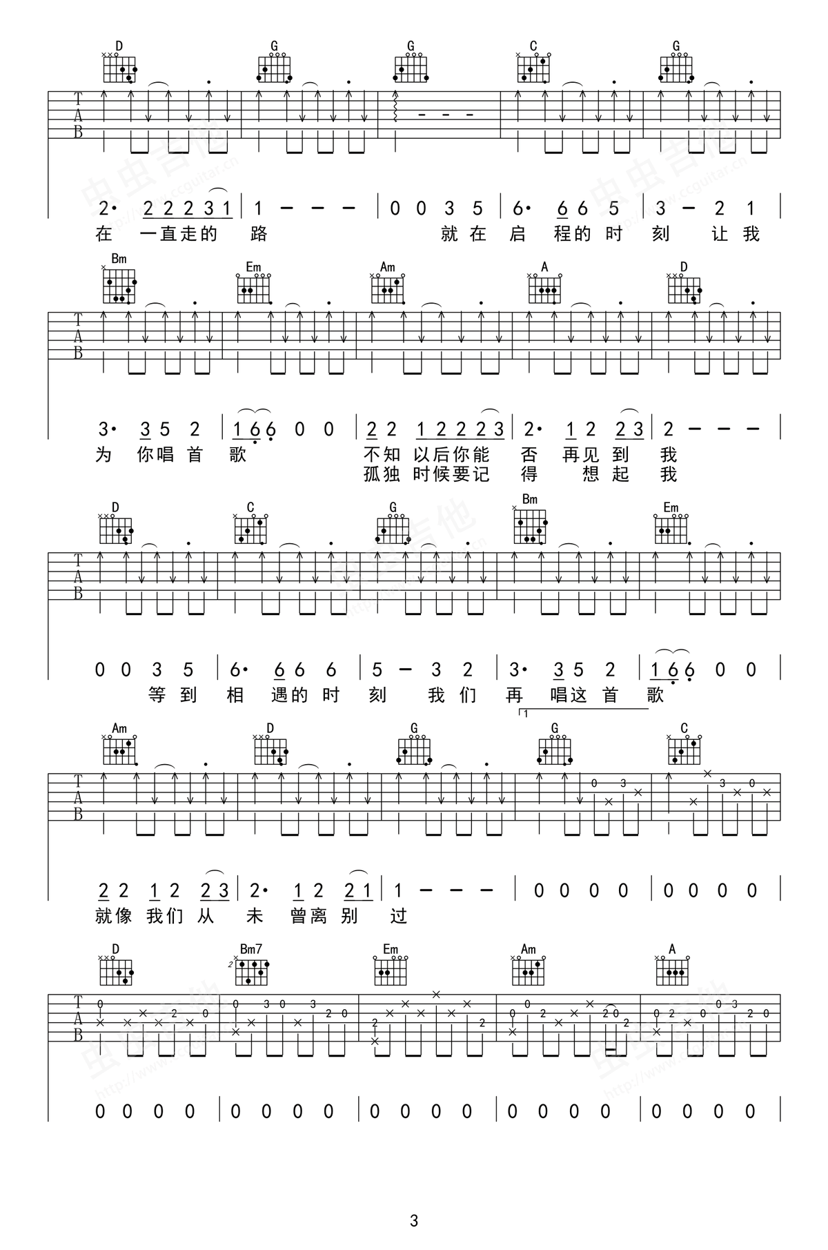 《启程》吉他弹唱谱,G调指法编配,Capo夹一品,完整版六线谱编配共五张图片谱例。以扫弦节奏为主,中间有切音技巧,让歌曲更加充满律动感。
