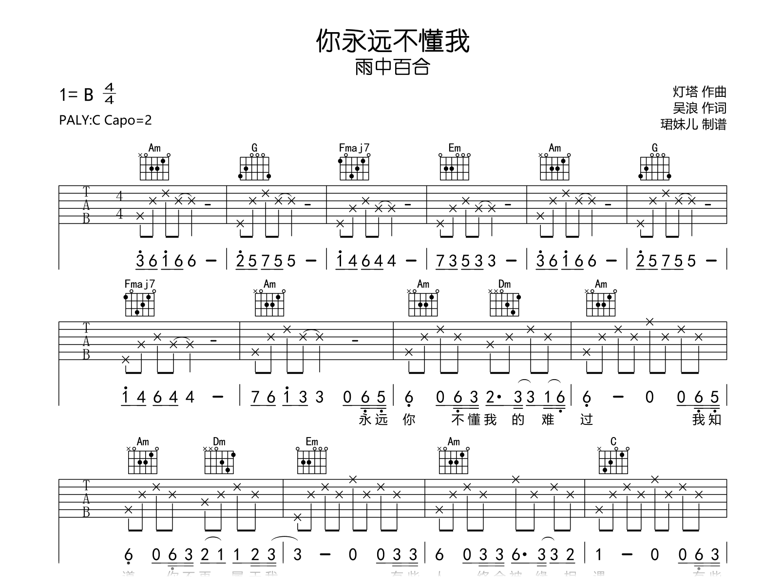 你永远不懂我吉他谱,雨中百合演唱,《你永远不懂我》吉他弹唱谱,原调为B,采用C调指法编配,建议变调夹2品,演奏速度75BPM,易上手难度较简单。