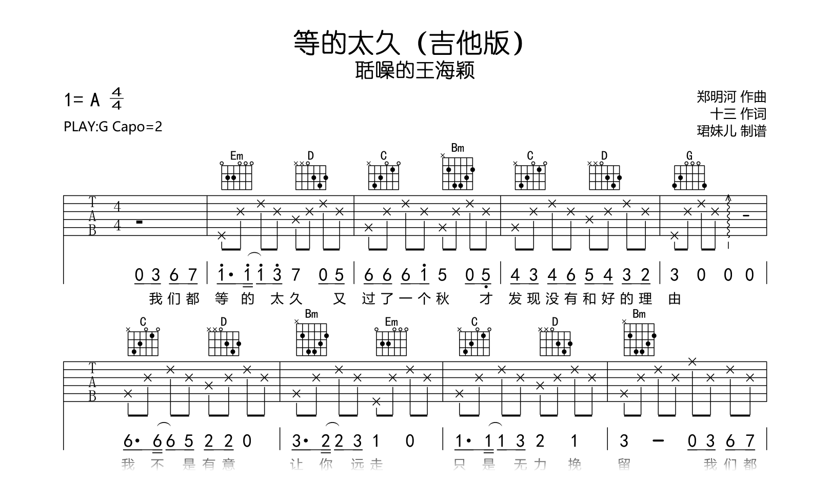 等的太久吉他谱,聒噪的王海颖吉他版,时光就像沙漏,我们却等的太久。《等的太久》吉他弹唱谱,原曲为A,本谱采用G调指法编配,建议变调夹2品,速度85BPM,演奏难度较简单易上手。六线谱完整版共三张高清图片谱例。