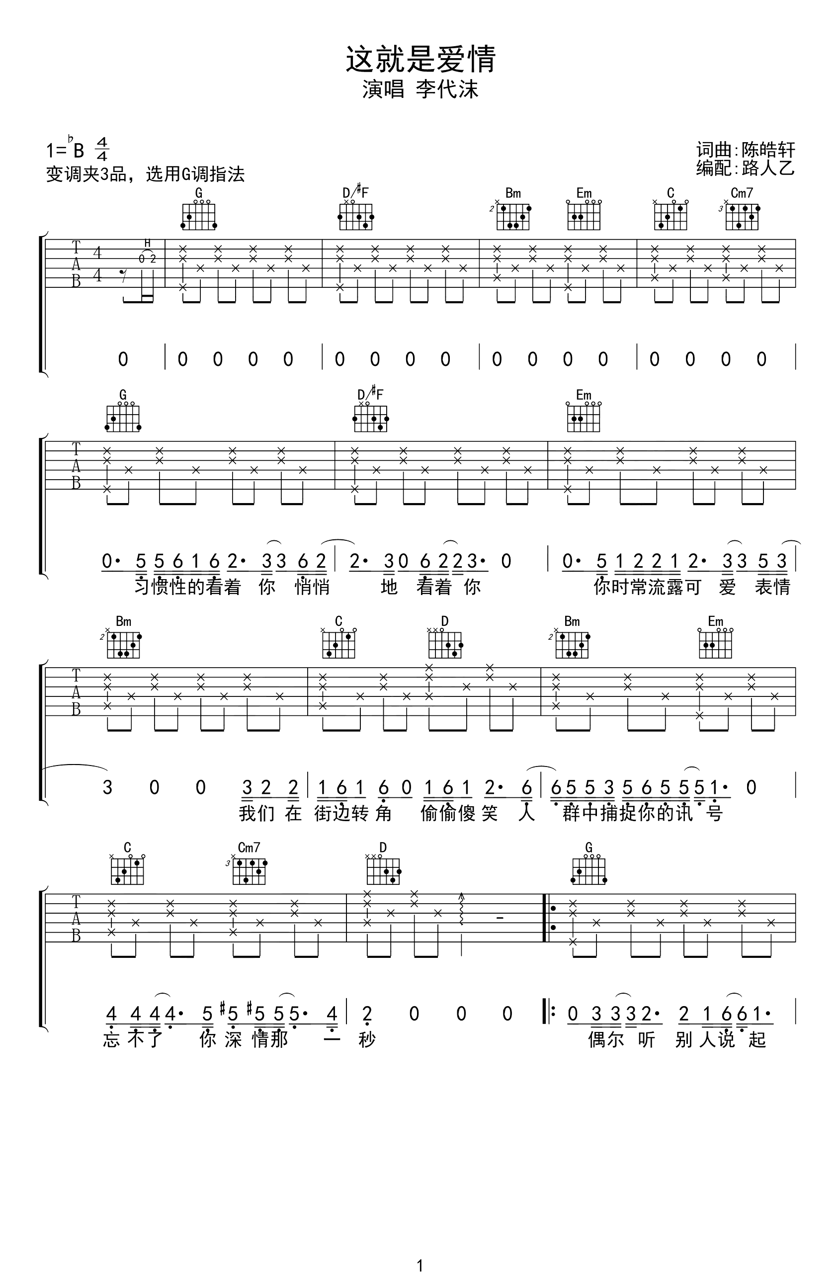 这就是爱情吉他谱,李代沫演唱,细腻的情感唱出了爱情最好的结局,我们会深情拥抱,我们会一直到老。《这就是我们》吉他弹唱谱,原调bB,变调夹夹第三品,选用G调指法编配。
