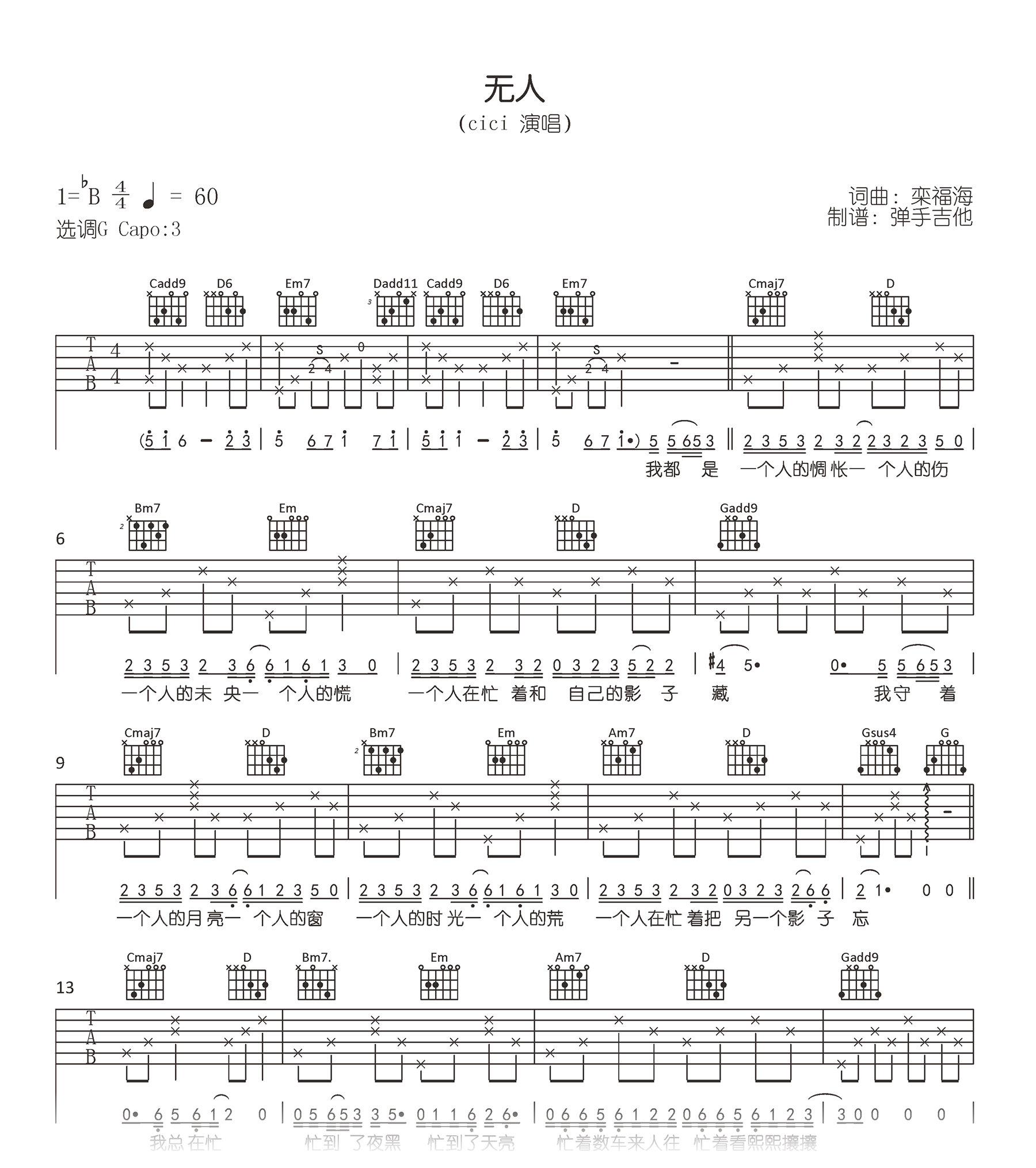 无人吉他谱,CICI演唱,一首又像民谣又像古风的一首歌曲。《无人》吉他弹唱谱,原调bB,选用G调指法编配,Capo夹三品,完整版共两张高清图片六线谱。