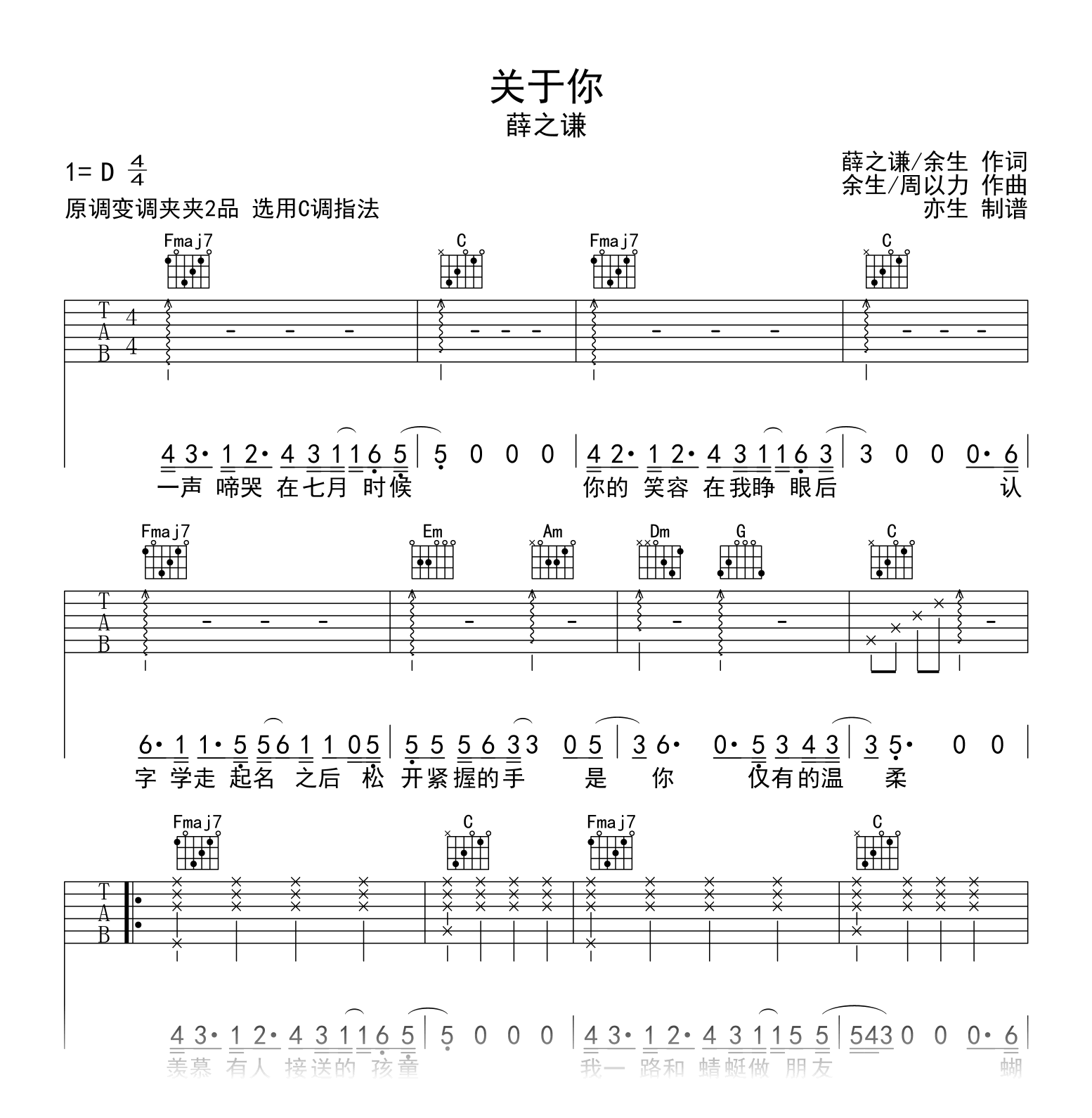 关于你吉他谱,薛之谦的一首寄怀新歌,缓缓吟唱着心中无限的情感与怀恋。《关于你》吉他弹唱谱,原调D,选用C调指法,变调夹夹第二品,节奏4/4拍,速度90左右,难度简单。