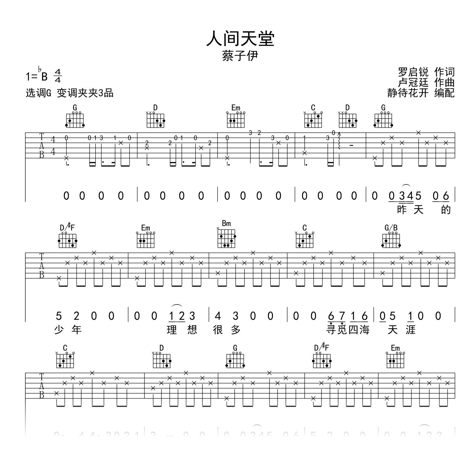 人间天堂吉他谱,蔡子伊《中国好声音》舞台演唱的一首粤语歌曲,《人间天堂》吉他弹唱谱,原调bB,选用G调和弦指法编配,推荐变调夹夹第三品,演奏的速度控制在每分钟70拍左右。