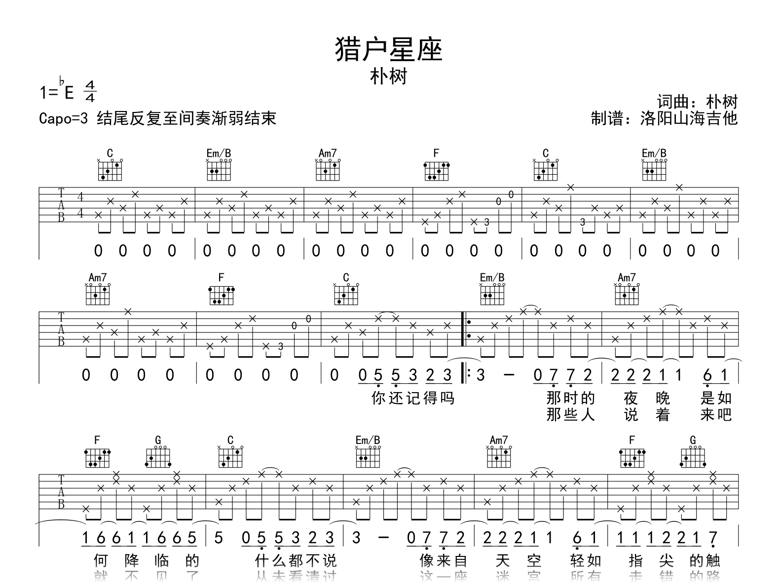 猎户星座吉他谱,朴树的一首经典代表歌曲,引领我们对未来充满希冀并勇敢前行。《猎户星座》吉他弹唱谱,选用C调和弦指法,原调为bE调,建议变调夹capo3品,结尾反复至间奏渐弱结束。