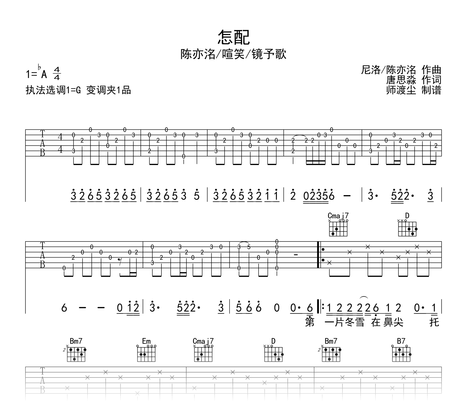 怎配吉他谱,镜予歌/喧笑/陈亦洺演唱,怎配吉他弹唱谱,原调bA调,采用G调和弦指法编配,推荐变调夹夹第一品,速度每分钟80拍左右,演奏难度简单。