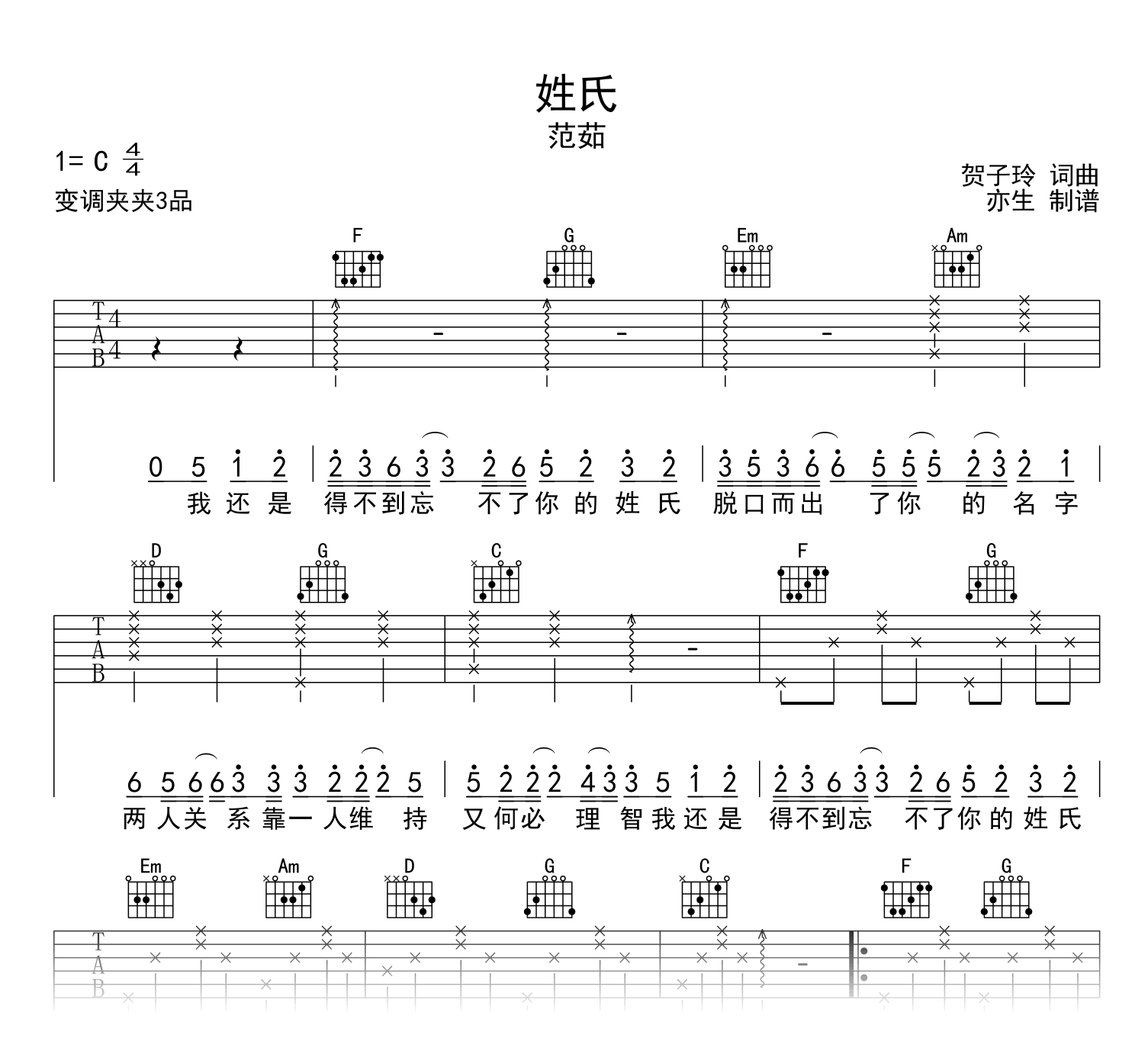 姓氏吉他谱,范茹演唱的新歌,姓氏吉他弹唱谱,采用C调指法,节奏4/4拍,速度95,变调夹夹3品,演奏难度简单。完整编配共两张高清图片谱例。