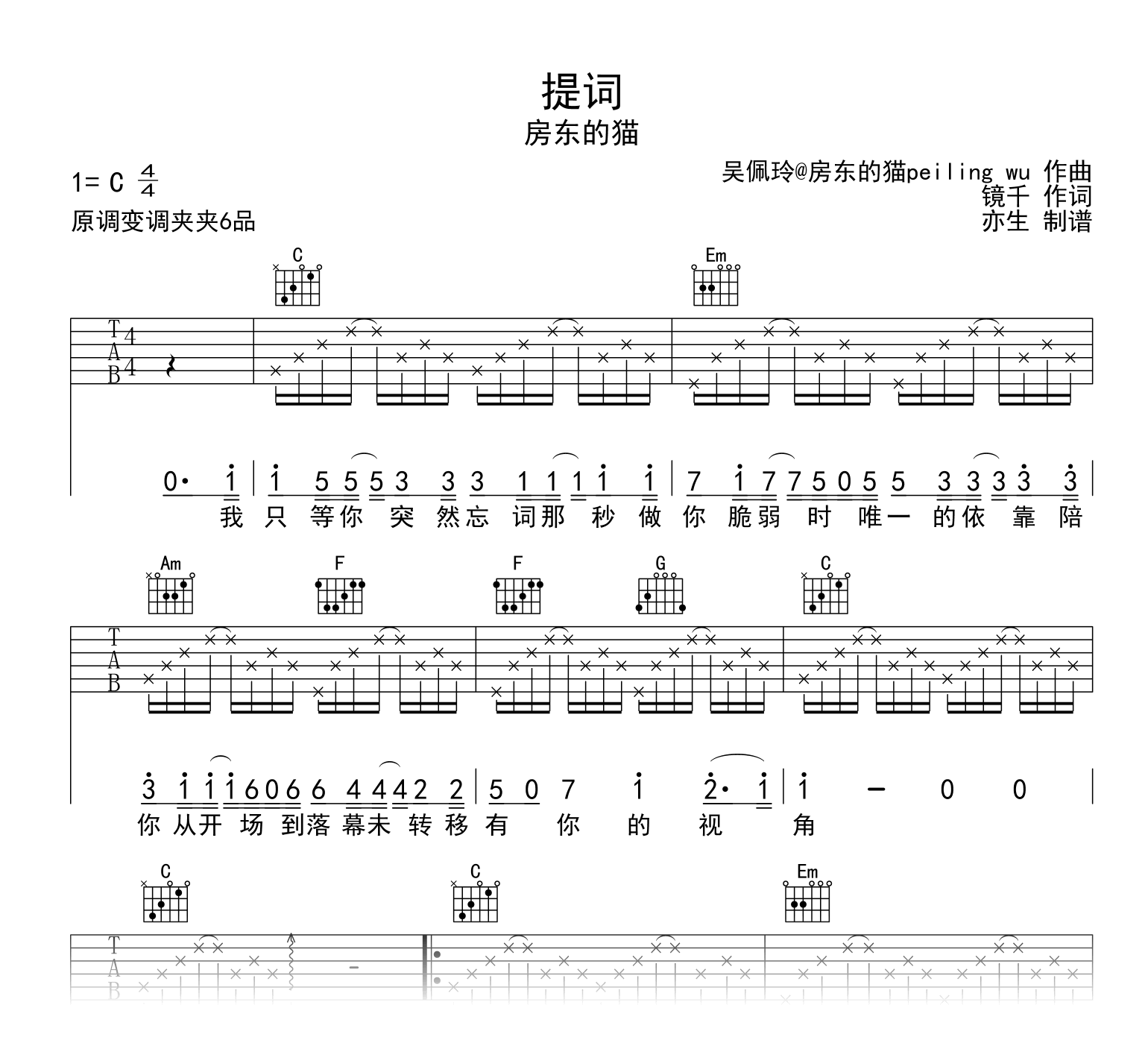 提词吉他谱,房东的猫新歌单曲,《提词》吉他弹唱谱,采用C调和弦指法编配,变调夹夹第六品,节奏4/4拍,速度控制在每分钟95拍左右,演奏简单。
