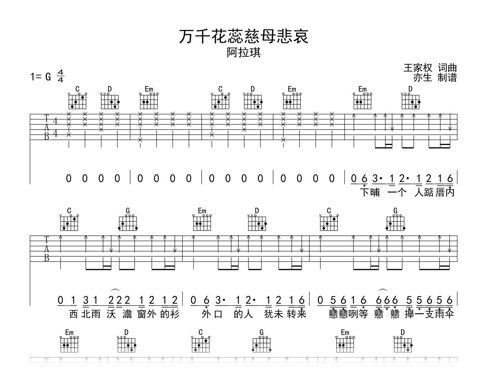 万千花蕊慈母悲哀吉他谱,阿拉琪演唱的一首热门闽南语歌曲,《万千花蕊慈母悲哀》吉他弹唱谱,采用G调和弦指法演奏,推荐变调夹不夹,节奏4/4拍,演奏速度大约每分钟95拍,演奏难度简单。
