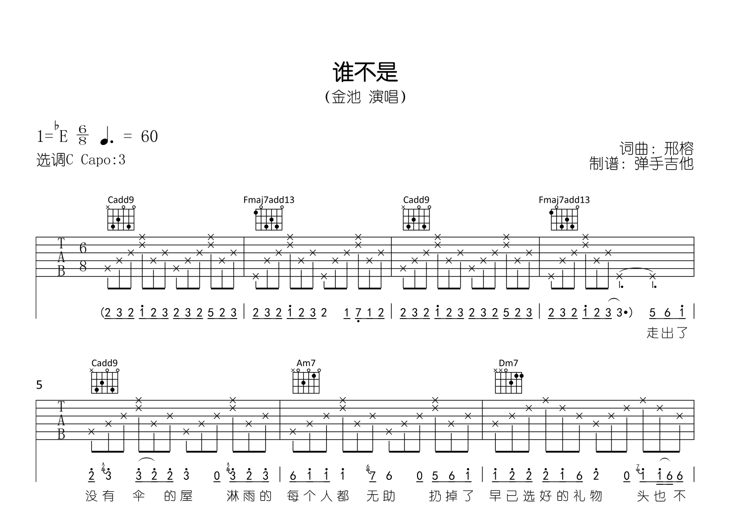 谁不是吉他谱,金池的一首伤感情歌,唱出了人生路上无数的心痛与酸楚。《谁不是》吉他弹唱谱,原调bE,选用C调指法编配,变调夹Capo3品,六线谱共三张高清图片谱例。