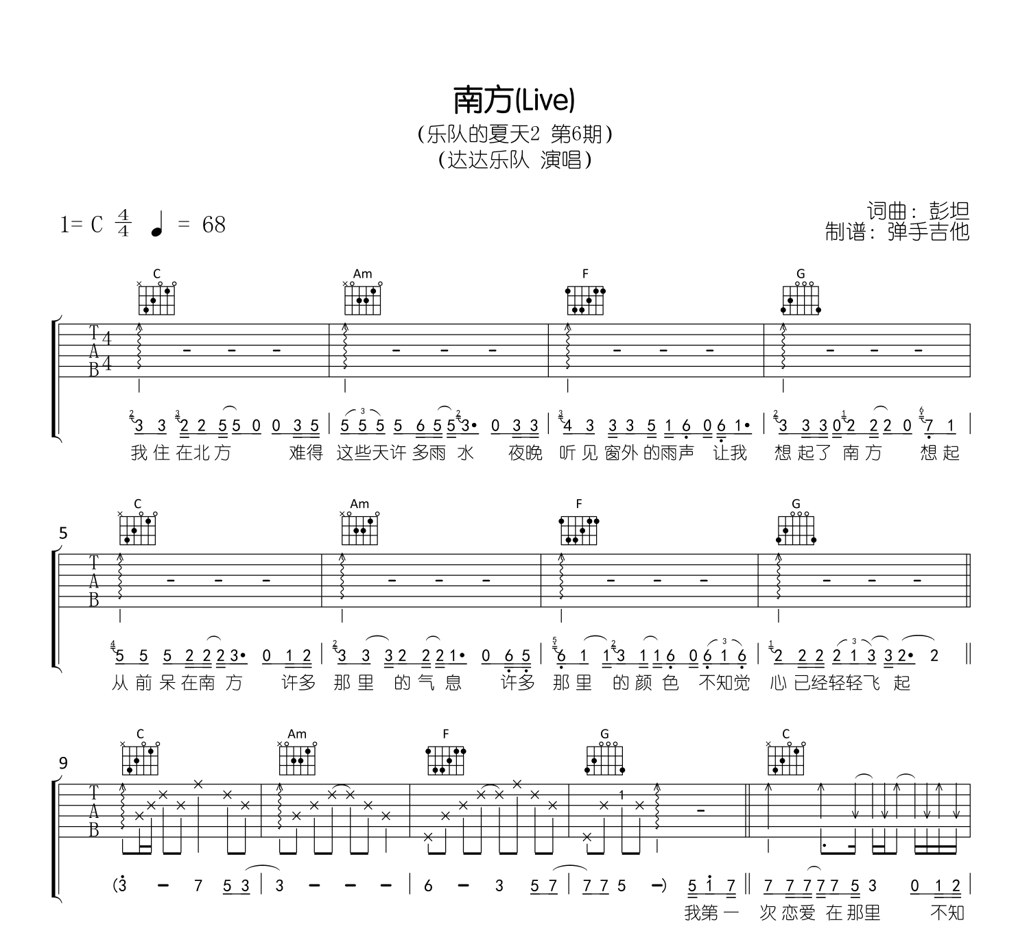 南方吉他谱,达达乐队演唱的一首经典代表歌曲,《乐队的夏天》 (Live版本),《南方》吉他弹唱谱,选用C调和弦指法编配,完整版六线谱共三张高清图片。