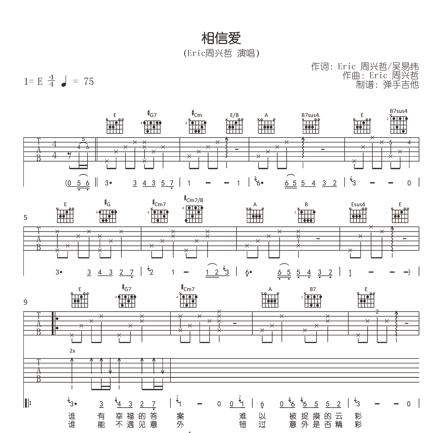 相信爱吉他谱,周兴哲演唱的一首动听情歌。《相信爱》吉他弹唱谱,E调和弦指法原版精编,注意特殊和弦按法,完整版共三张高清图片谱。