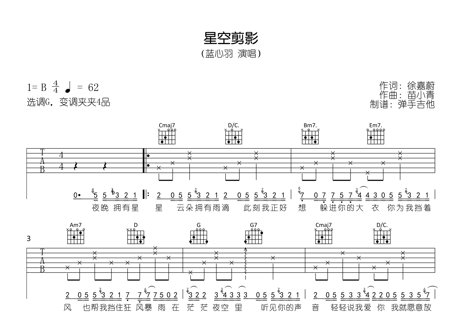 星空剪影吉他谱,蓝心羽演唱,《星空剪影》吉他弹唱谱,原调B,选用C调(降半音调弦)和G调指法(变调夹夹第四品),两个版本编配,演奏速度每分钟62拍左右,吉他谱精编各两张高清图片六线谱例。
