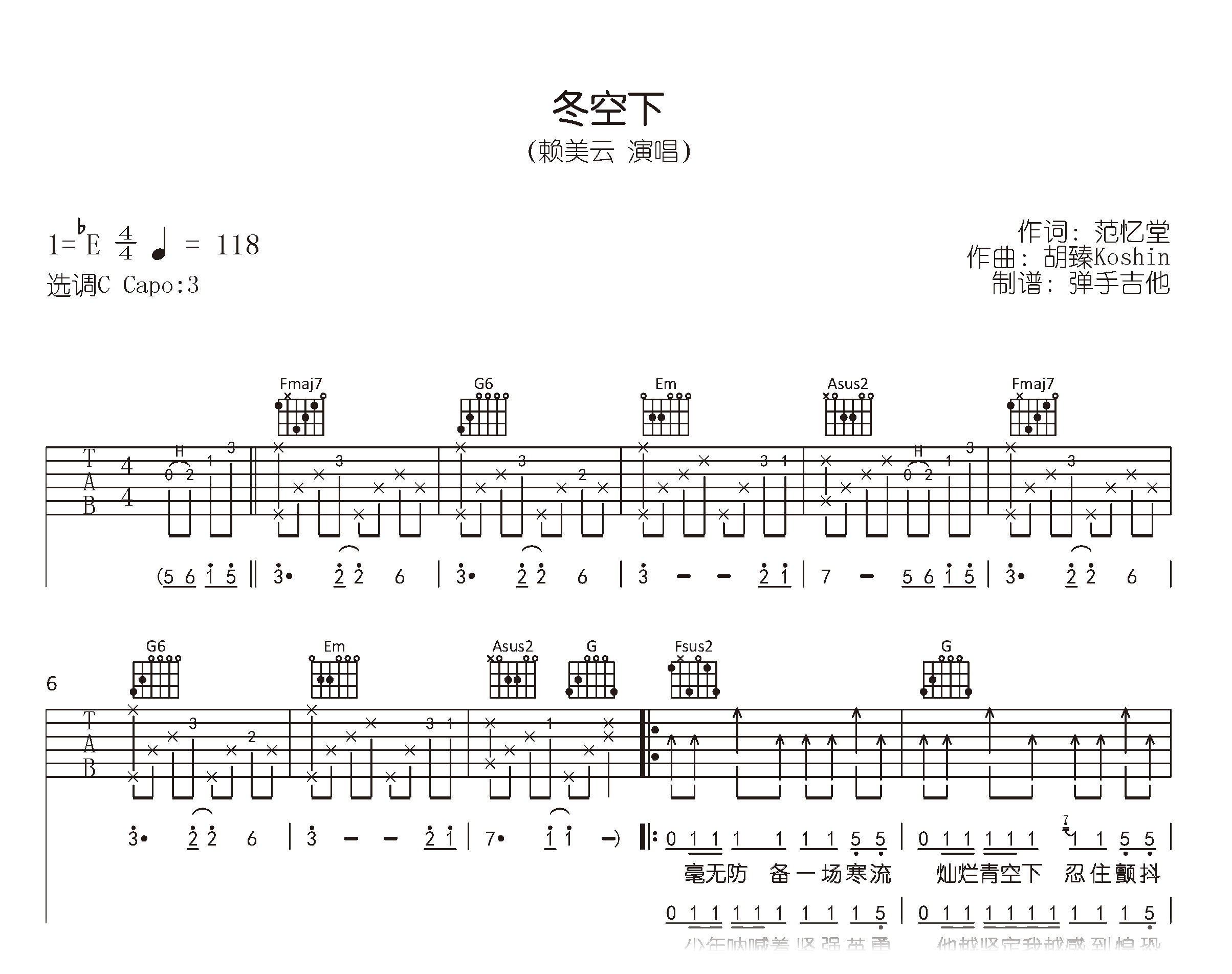 冬空下吉他谱,赖美云演唱,《冬空下》吉他弹唱谱,原调bE,选用C调指法精编,变调夹Capo3品,节奏4/4拍,演奏每分钟速度118拍,吉他六线谱高清版共三张图片谱例。
