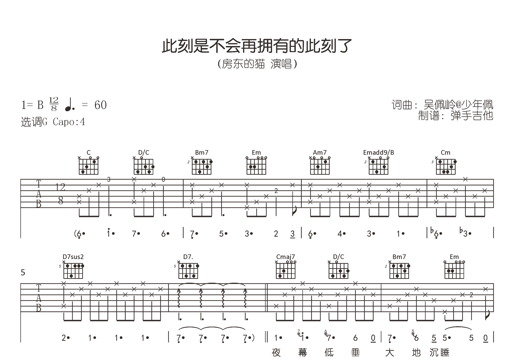 此刻是不会再拥有的此刻了吉他谱,房东的猫演唱,《此刻是不会再拥有的此刻了》吉他弹唱谱,原版精编选用G调指法,变调夹Capo4品,高清六线谱共三张图片谱例。