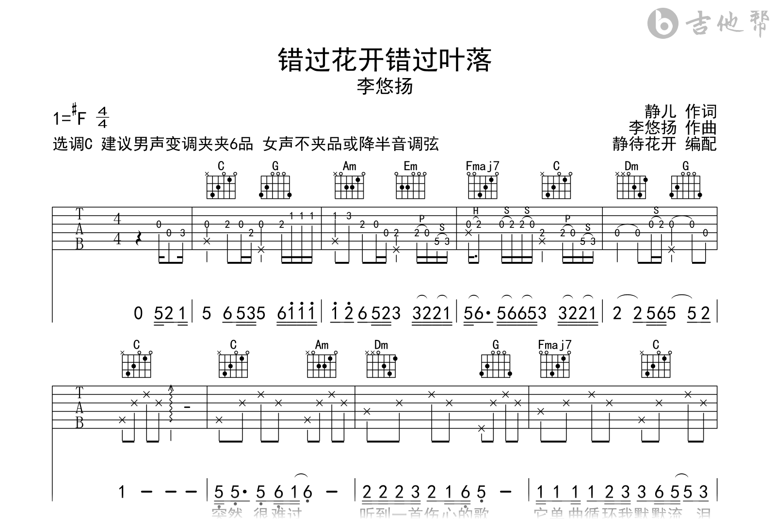 错过花开错过叶落吉他谱,李悠扬演唱,花开叶落,多少缘分被错过?《错过花开错过叶落》吉他弹唱谱,编配制谱采用C调和弦编配,建议男声夹6品,女声不夹品或降半音调弦,原调#F调,琴友们也可根据个人嗓音灵活选择变调夹位置,速度大概80拍每分钟,演奏难度简单。
