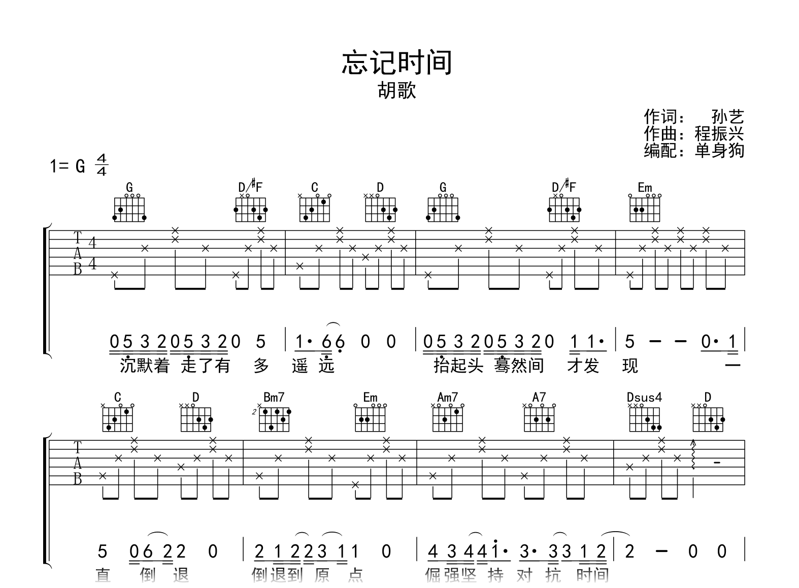 忘记时间吉他谱,胡歌演唱,《仙剑奇侠传三》的片尾曲,《忘记时间》吉他弹唱谱,选用原调G调和弦指法编配,高清六线谱共三张图片谱例。