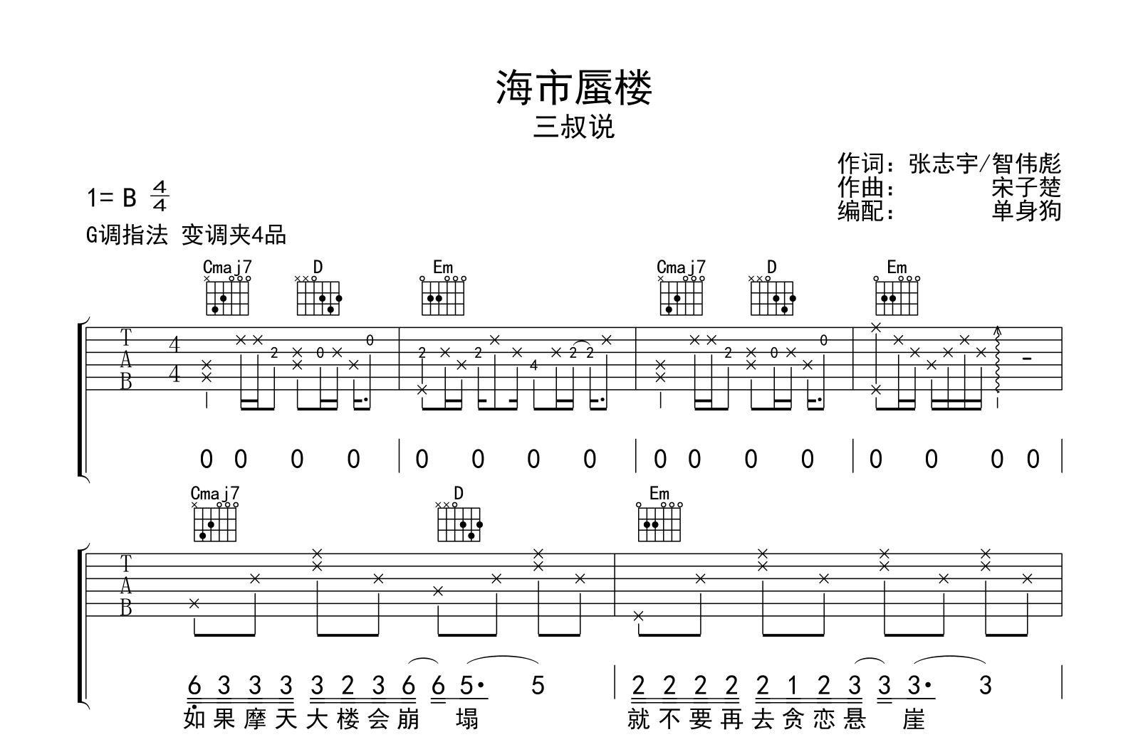 海市蜃楼吉他谱,三叔说演唱,《海市蜃楼》吉他弹唱六线谱,原调为B调,曲谱选用G调和弦指法编配,变调夹Capo4品,完整版共三张高清图片谱例。