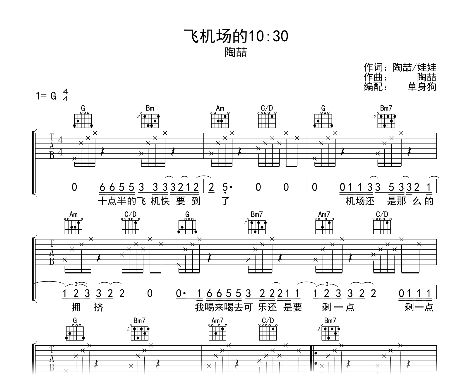 飞机场的10:30吉他谱,陶喆的一首经典R&B歌曲,《飞机场的10:30》吉他弹唱谱,G调和弦指法编配,完整版共四张高清图片谱。