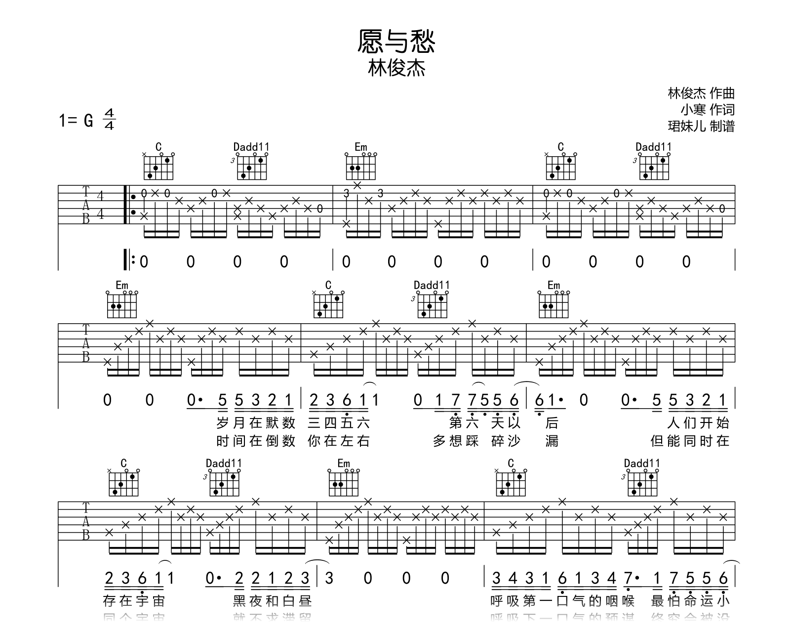 愿与愁吉他谱,林俊杰新歌,让我们在动人的故事和动听的旋律中找到治愈。《愿与愁》吉他弹唱谱,用G调指法编配,速度75难度较简单,演奏易上手。