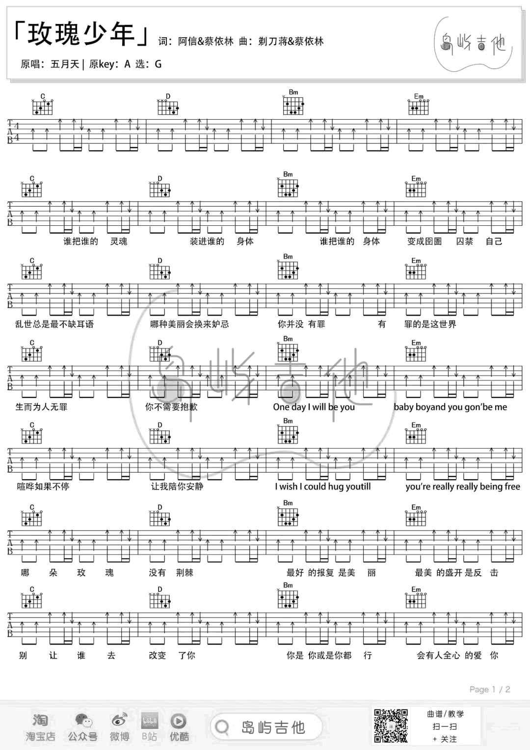 蔡依林的一首歌曲,献给所有自由的灵魂,我们都是最好的自己,五月天的翻唱又为这首歌增加了力量。玫瑰少年吉他谱,原调A选调G,《玫瑰少年》吉他弹唱谱,三张图片谱例。不一样又怎样!勇敢做自己!生而为人无罪,你不需要抱歉。你们知道玫瑰少年叶永志吗?他曾经是个善良温柔的男孩子,可是这么美好的生命,却在15岁那年就截止了,