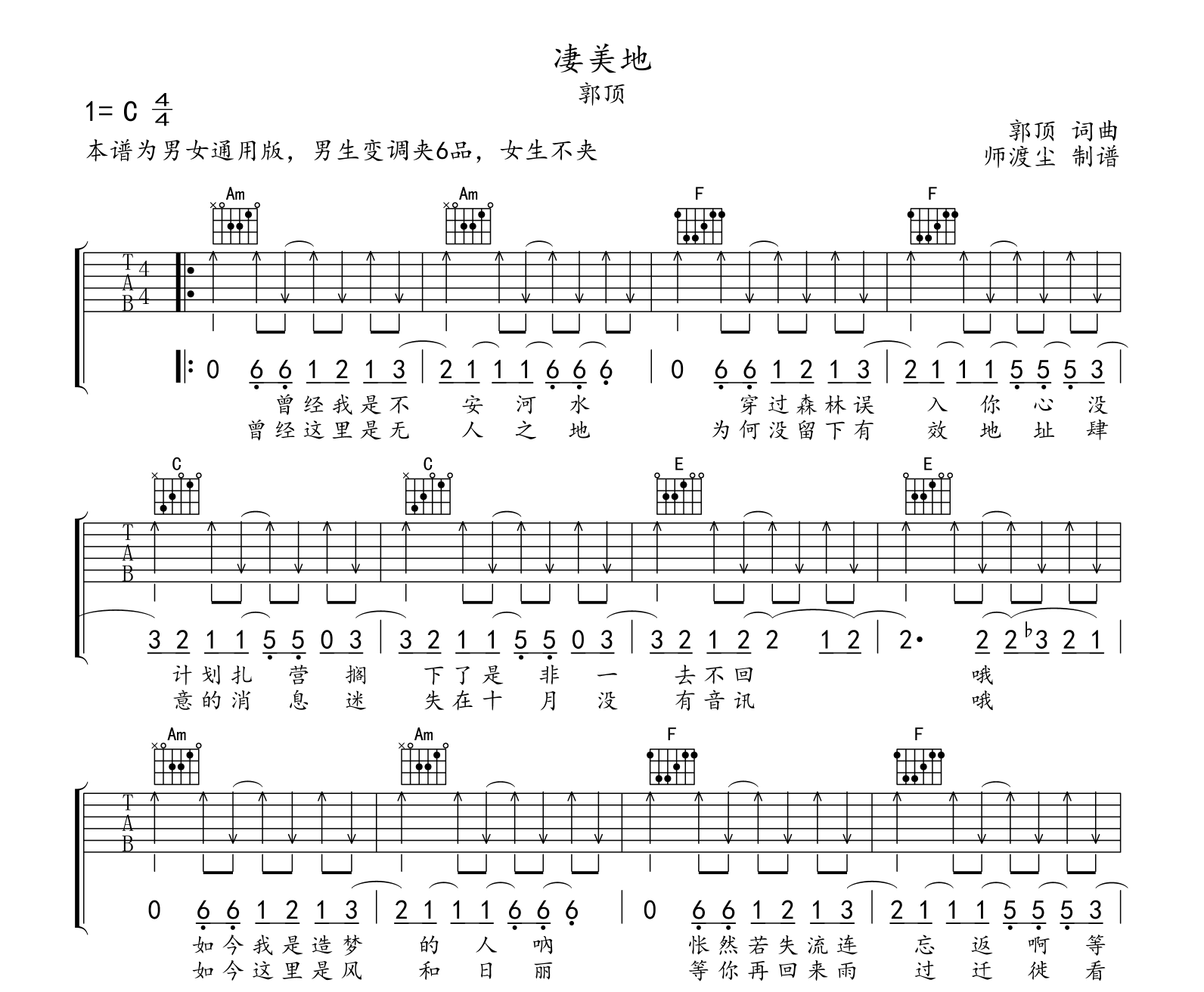 凄美地C调吉他谱,郭顶作词作曲并演唱,《凄美地》吉他弹唱谱,男女通用版本,选用C调指法扫弦版编配,女生不夹变调夹,男生建议变调夹6品,高清六线谱共三张图片。