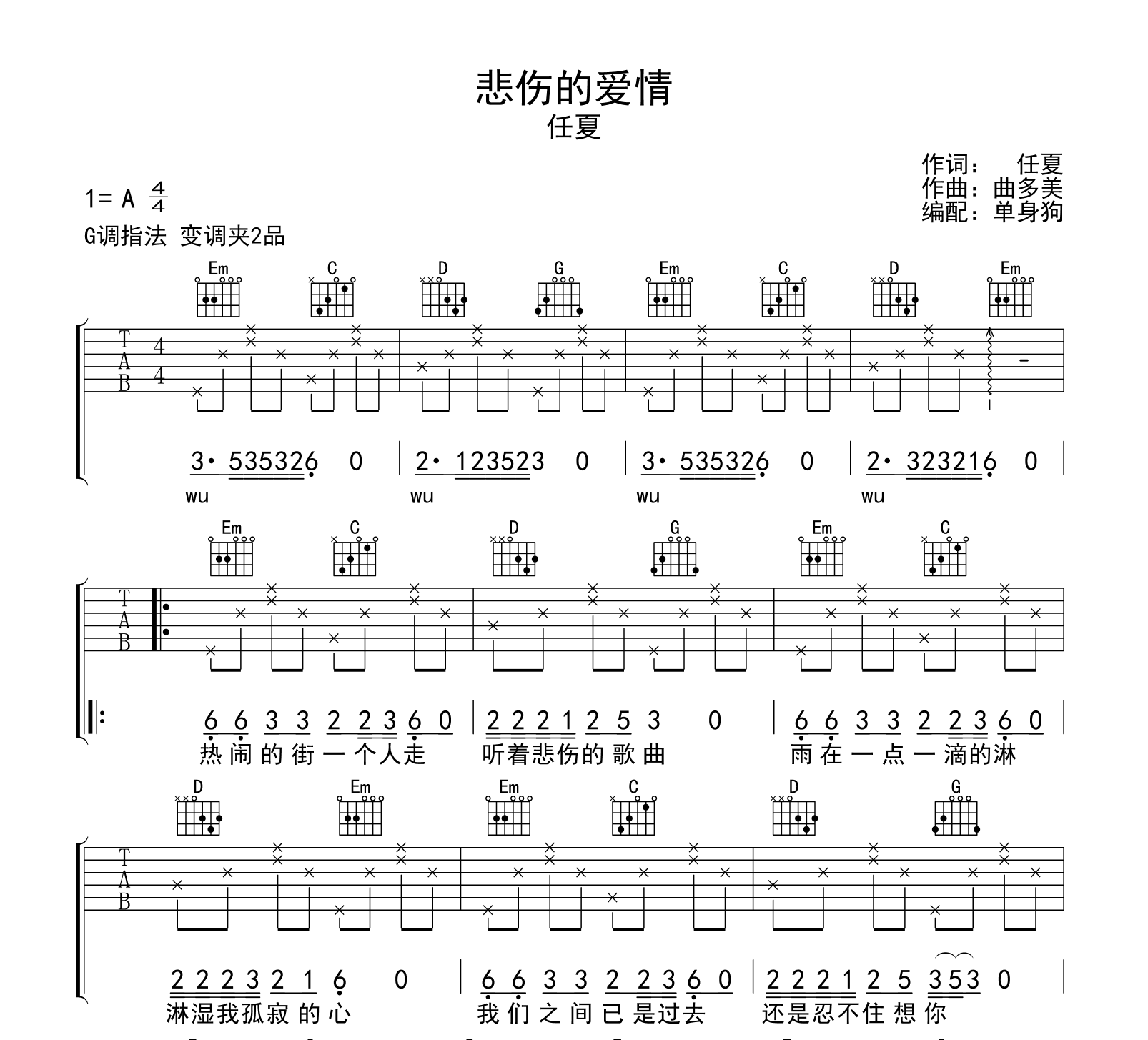悲伤的爱情吉他谱,任夏演唱的一首网络热门歌曲。《悲伤的爱情》吉他弹唱六线谱,原调A调,选用G调指法,变调夹Capo2品,共两张高清图片谱例。