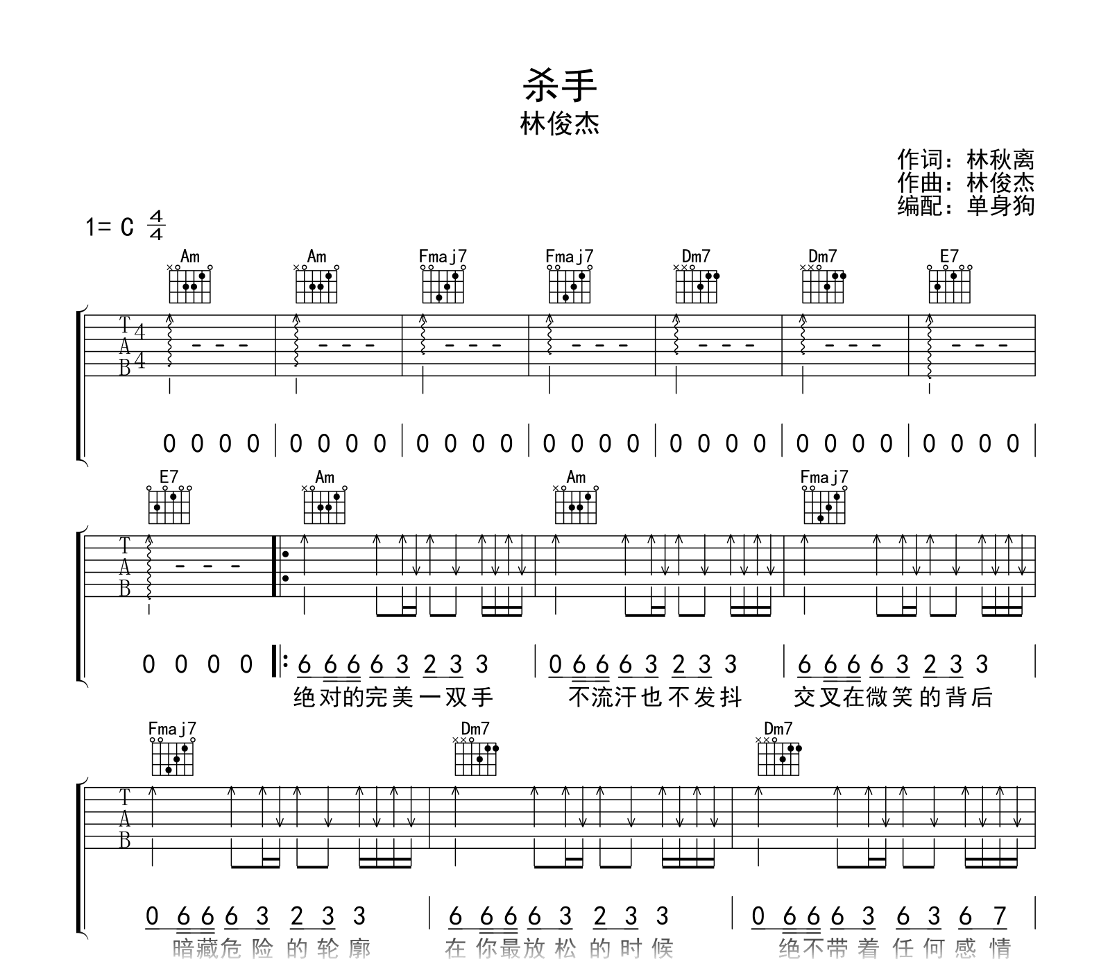 杀手吉他谱,林俊杰的一首充满节奏感的经典老歌。《杀手》吉他弹唱谱,C调和弦指法,完整版编配共三张高清图片六线谱。