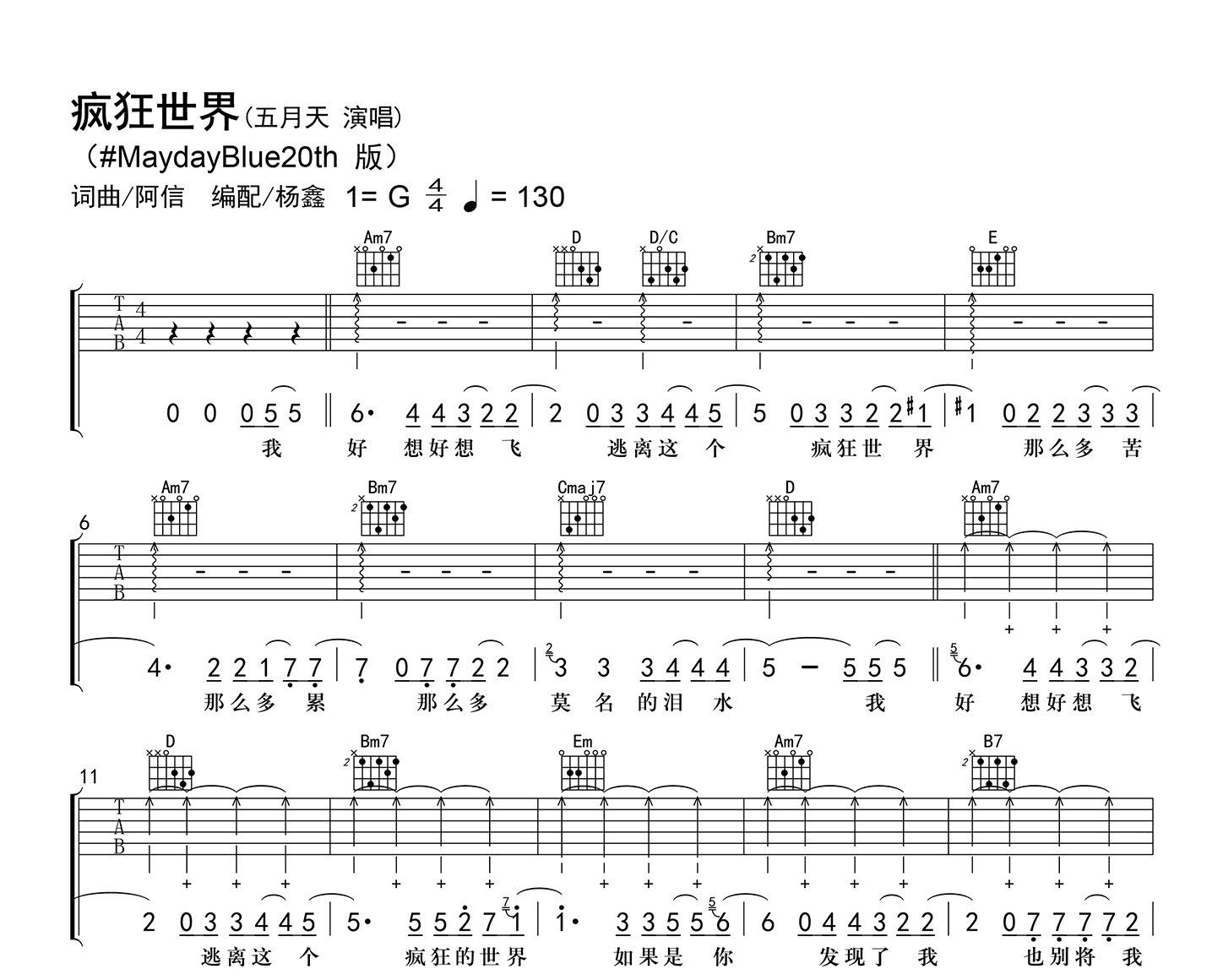 疯狂世界吉他谱,五月天演唱,20周年蓝色三部曲全新版本。《疯狂世界》吉他弹唱谱,采用标准调弦编配。原曲G调,选调G,每分钟130拍。高清六线谱根据原曲原汁原味精细整理。