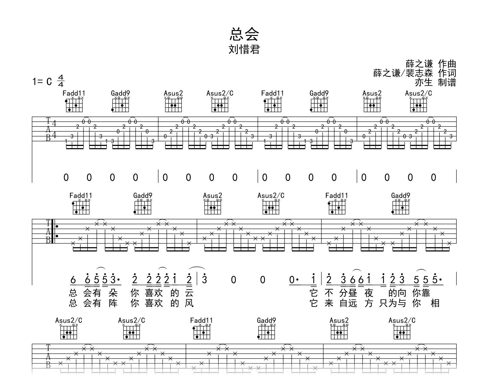 总会吉他谱,刘惜君演唱,诗意细腻的歌词,清澈纯净的声音,倾诉着时空中编织的遗憾和期待。《总会》吉他弹唱谱,选用C调指法,完整六线谱编配,共三张高清图片谱例。