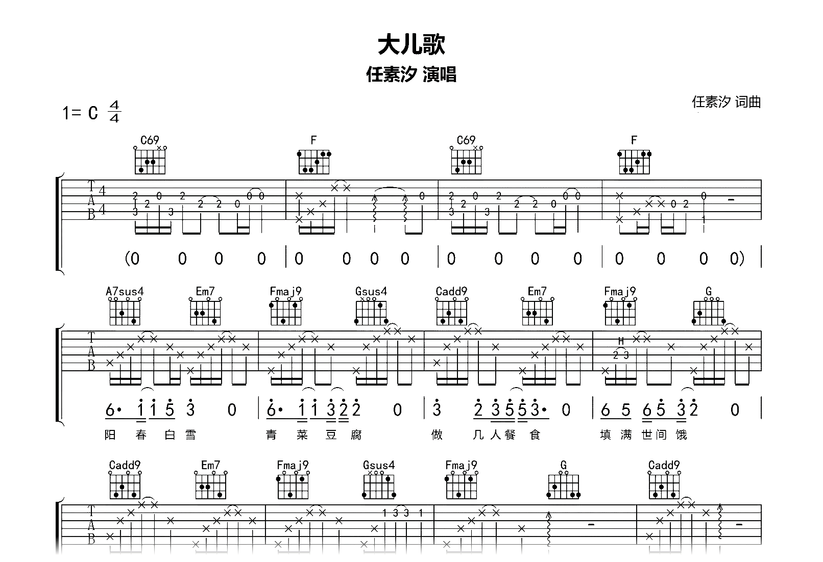 大儿歌吉他谱,任素汐与张弛深情对唱,《故乡别来无恙》告别曲。《大儿歌》吉他弹唱谱,采用了C调指法进行编配,共两张高清图片六线谱。