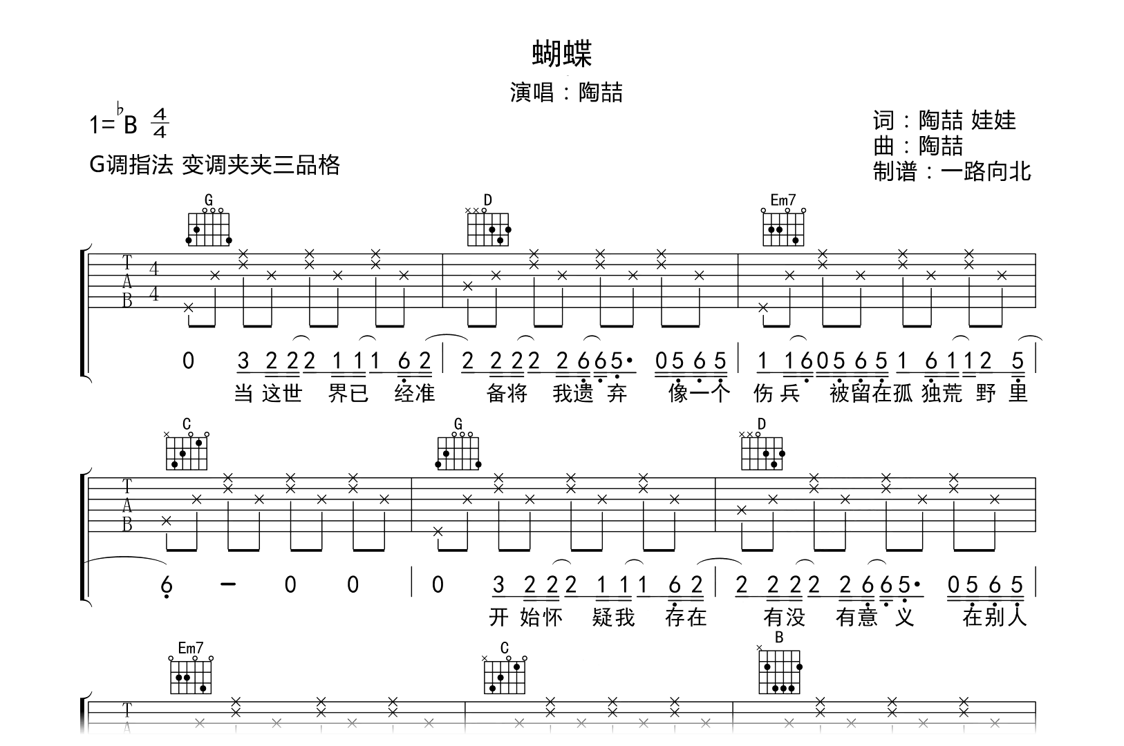 《蝴蝶》吉他谱,陶喆演唱的一首经典歌曲,拍号为4/4拍,歌曲原调为降B调,采用的是G调指法编配,变调夹3品弹奏即为原调,完整版共4张高清图片谱。附上吉他演奏音频方便琴友们参考练习。