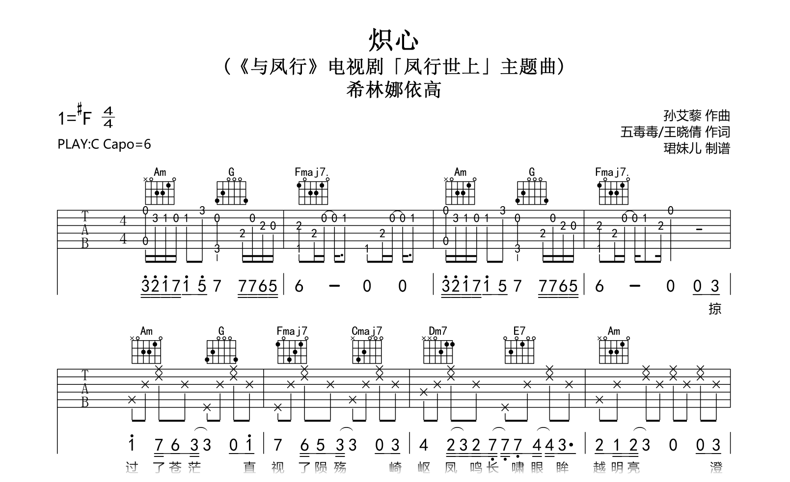 炽心吉他谱,希林娜依高献唱《与凤行》电视剧「凤行世上」主题曲,《炽心》吉他弹唱六线谱,原调升F,选用C调指法,变调夹Capo6品,完整高清版共三张图片谱。