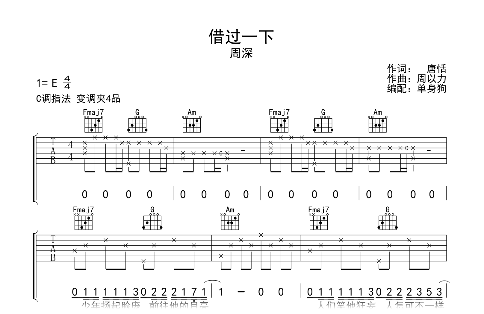 借过一下吉他谱,周深演唱《庆余年》片尾曲,《借过一下》吉他弹唱六线谱,原调E,选用C调指法,变调夹夹第四品,完整版共4张高清图片谱例。