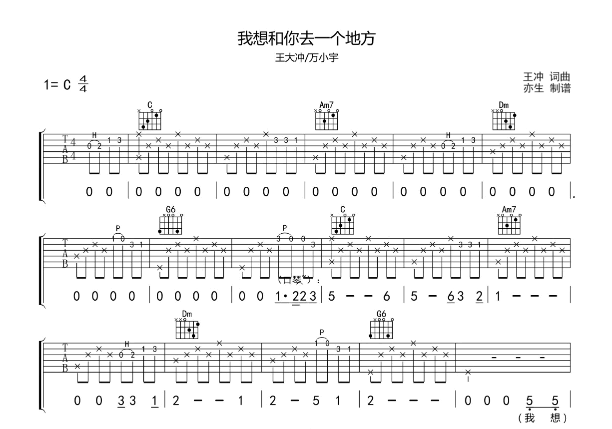我想和你去一个地方吉他谱,王大冲/万小宇演唱,《我想和你去一个地方》吉他弹唱谱,选用C调指法,原调演奏不用变调夹,高清六线谱共三张图片谱例。