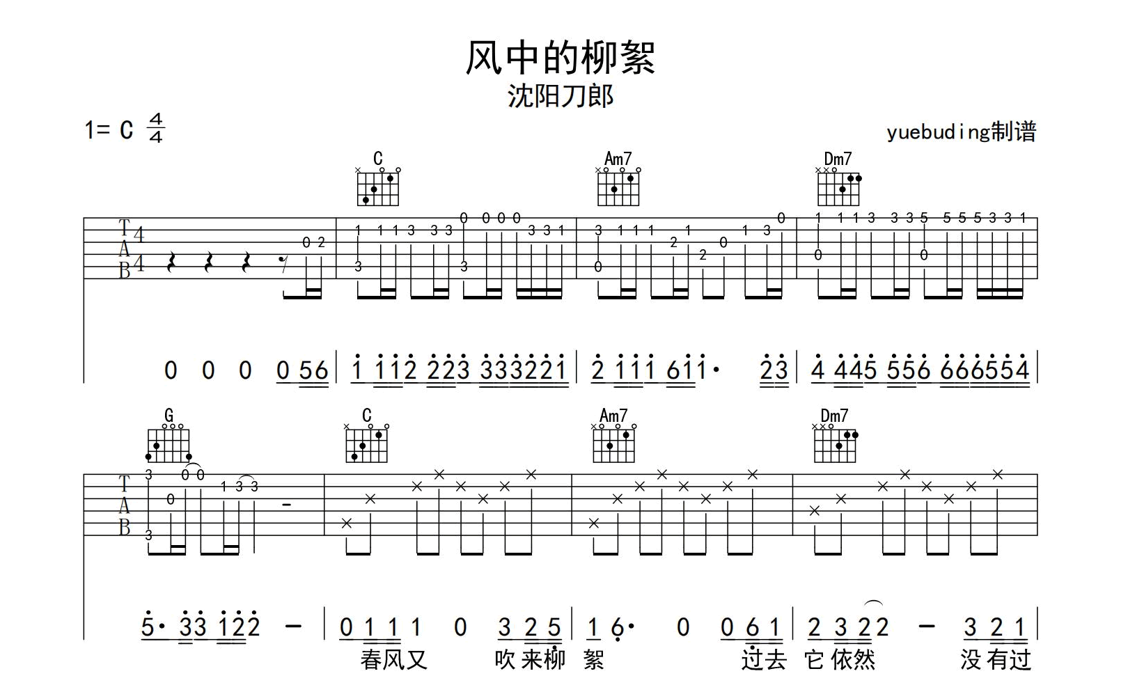 风中的柳絮吉他谱,沈阳刀郎演唱,《风中的柳絮》吉他弹唱谱,选用C调指法进行编配,原调演奏不用变调夹,完整版共三张高清图片六线谱。