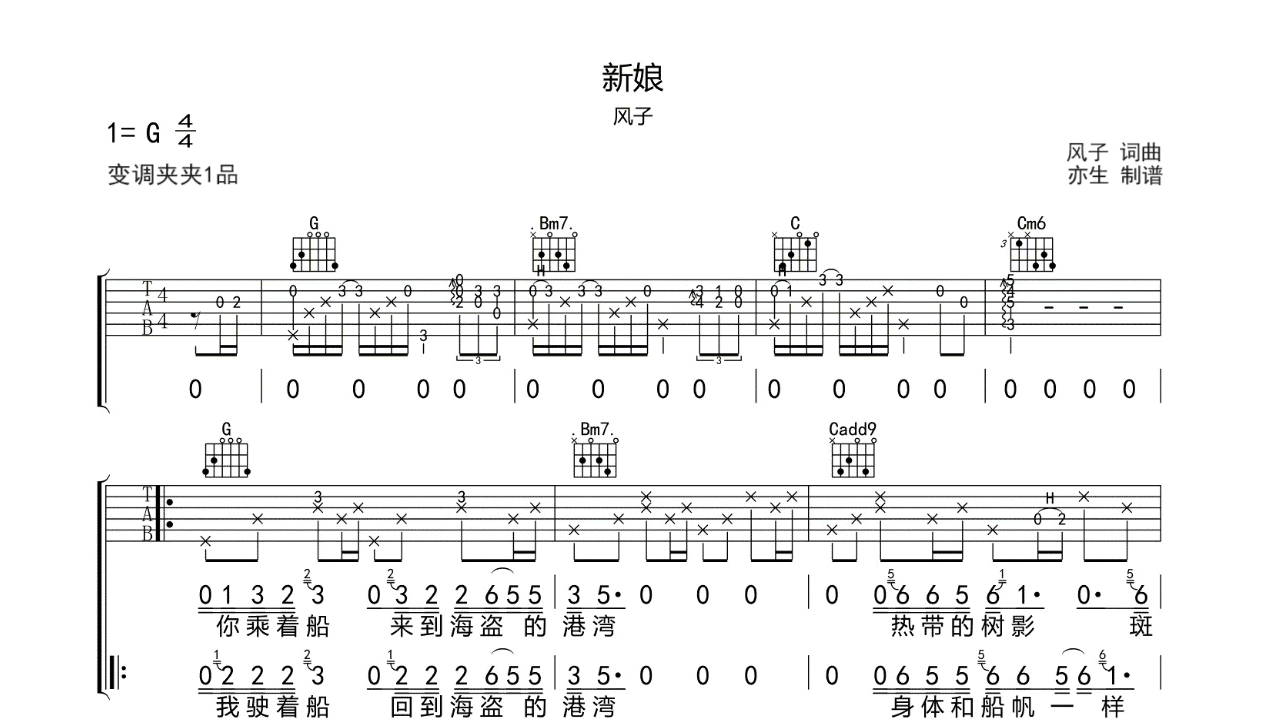 新娘吉他谱,风子的一首民谣歌曲,唱出内心那份纯真而坚定的爱意。《新娘》吉他弹唱谱,选用G调指法编配,变调夹Capo1品,完整版共3张高清图片六线谱。