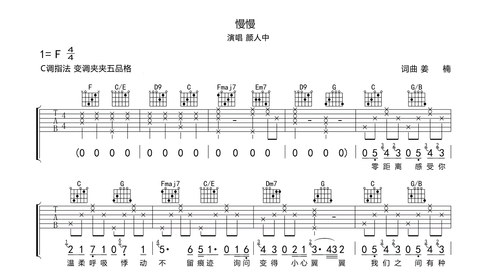 慢慢吉他谱,颜人中演唱,爱,在不疾不徐的步履间温柔以待。《慢慢》吉他弹唱谱,原调为F调,但由于原调指法比较难,为了方便弹奏,本吉他谱采用的是C调指法编配,变调夹5品弹奏。