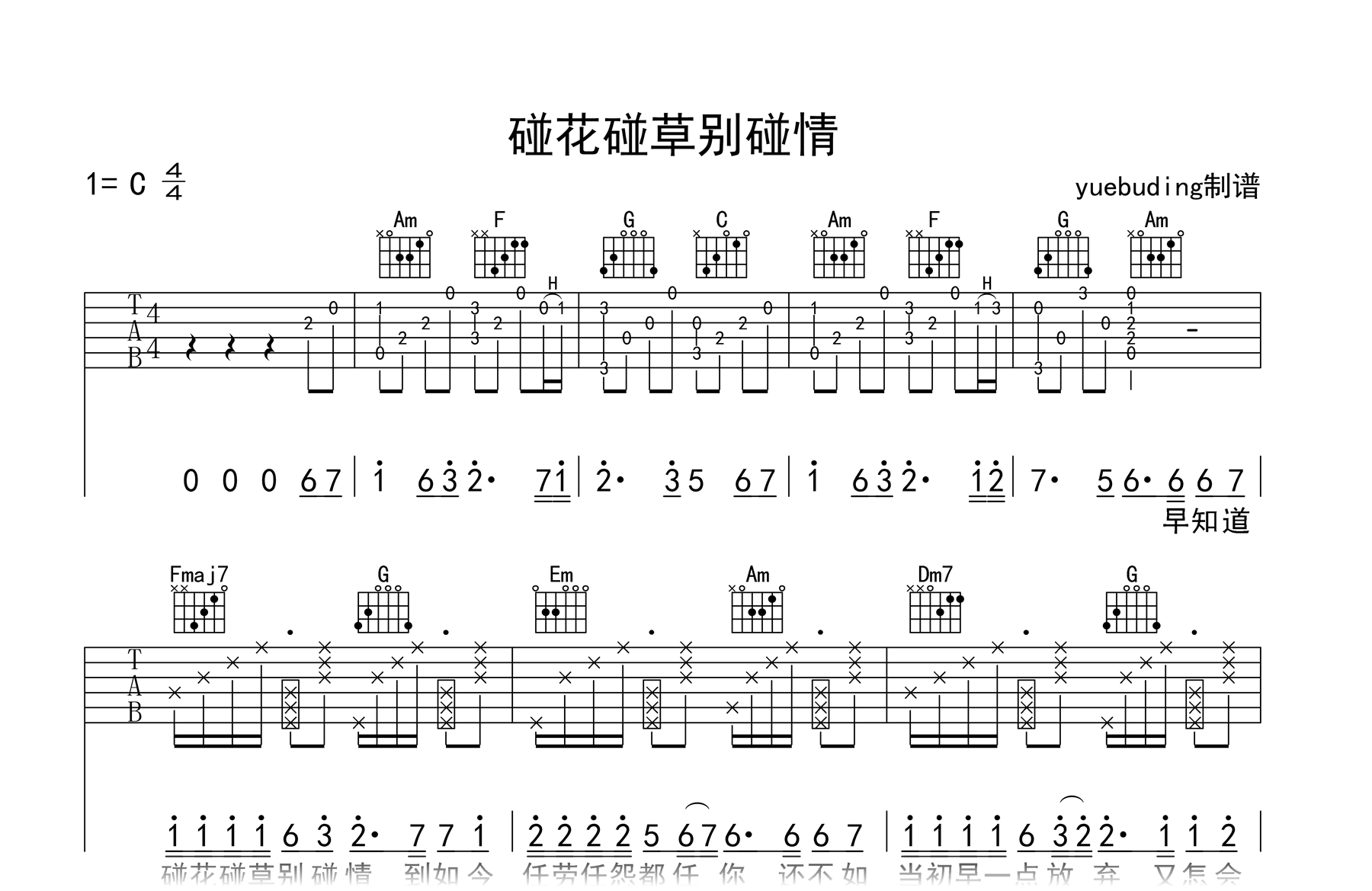碰花碰草别碰情吉他谱,怪阿姨演唱,《碰花碰草别碰情》吉他弹唱谱,原调bB,选用G调指法编配,变调夹Capo3品,完整版共两张高清图片六线谱。