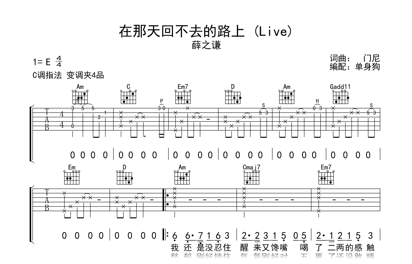 在那天回不去的路上吉他谱,薛之谦演唱,《在那天回不去的路上》吉他弹唱六线谱,原调E,采用C调指法编配,变调夹夹第四品,完整版共两张高清图片谱。