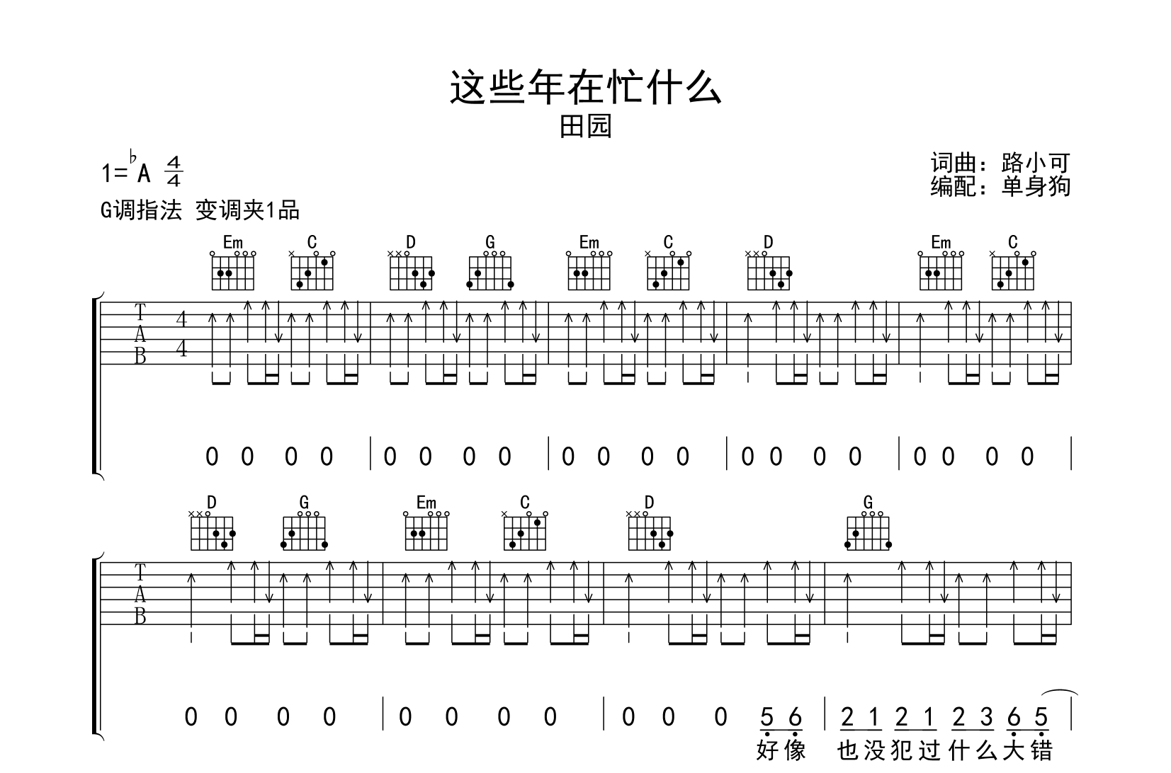 这些年在忙什么吉他谱,田园演唱,《这些年在忙什么》吉他弹唱六线谱,原调bA,选用G调指法进行编配,变调夹Capo1品,完整版共3张高清图片谱例。
