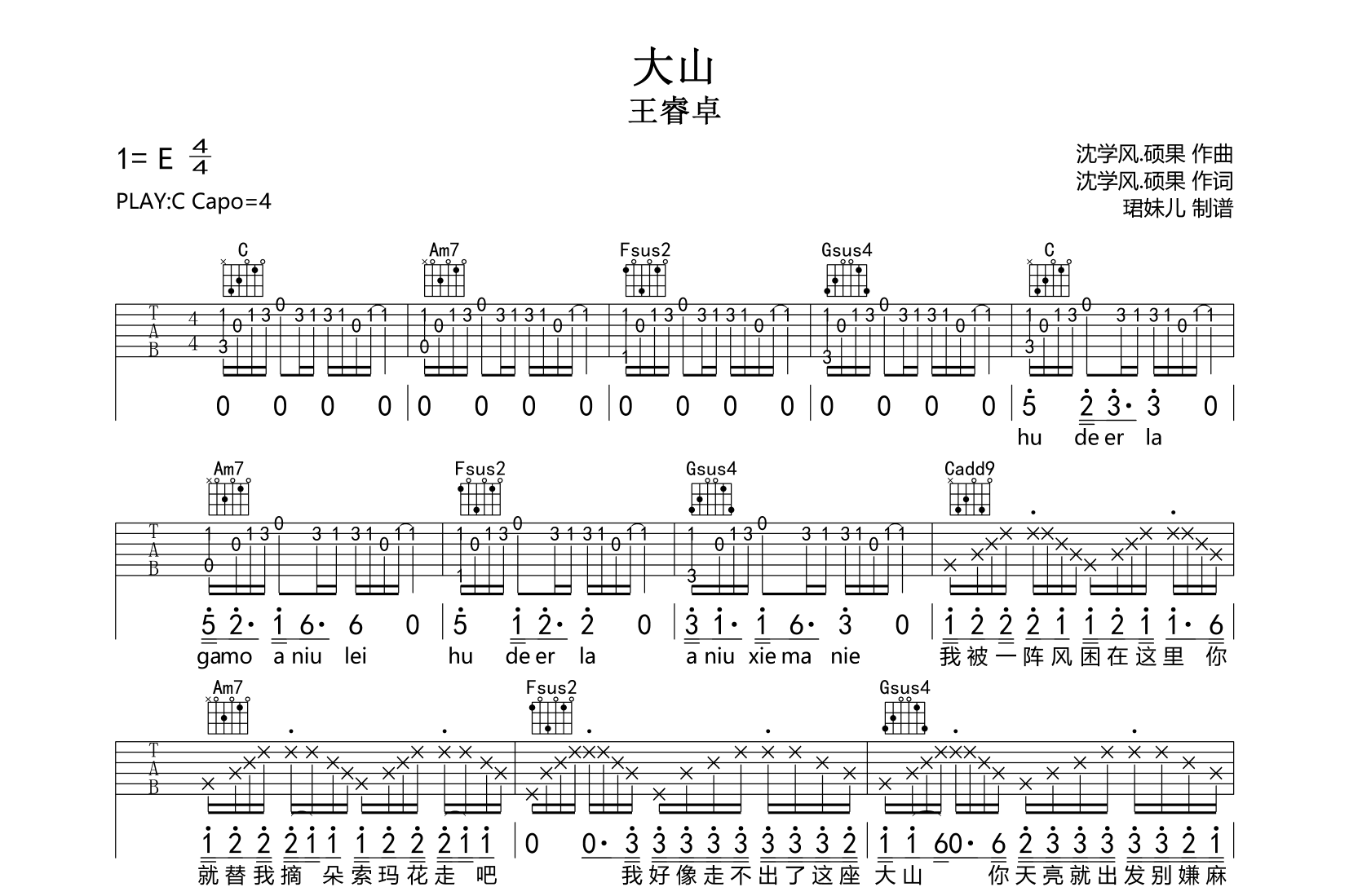大山吉他谱,王睿卓深情的演唱,诉说了对大山的敬畏与依恋。《大山》吉他弹唱谱,原调E,选用C调指法编配,变调夹Capo4品,完整版共两张高清图片六线谱。