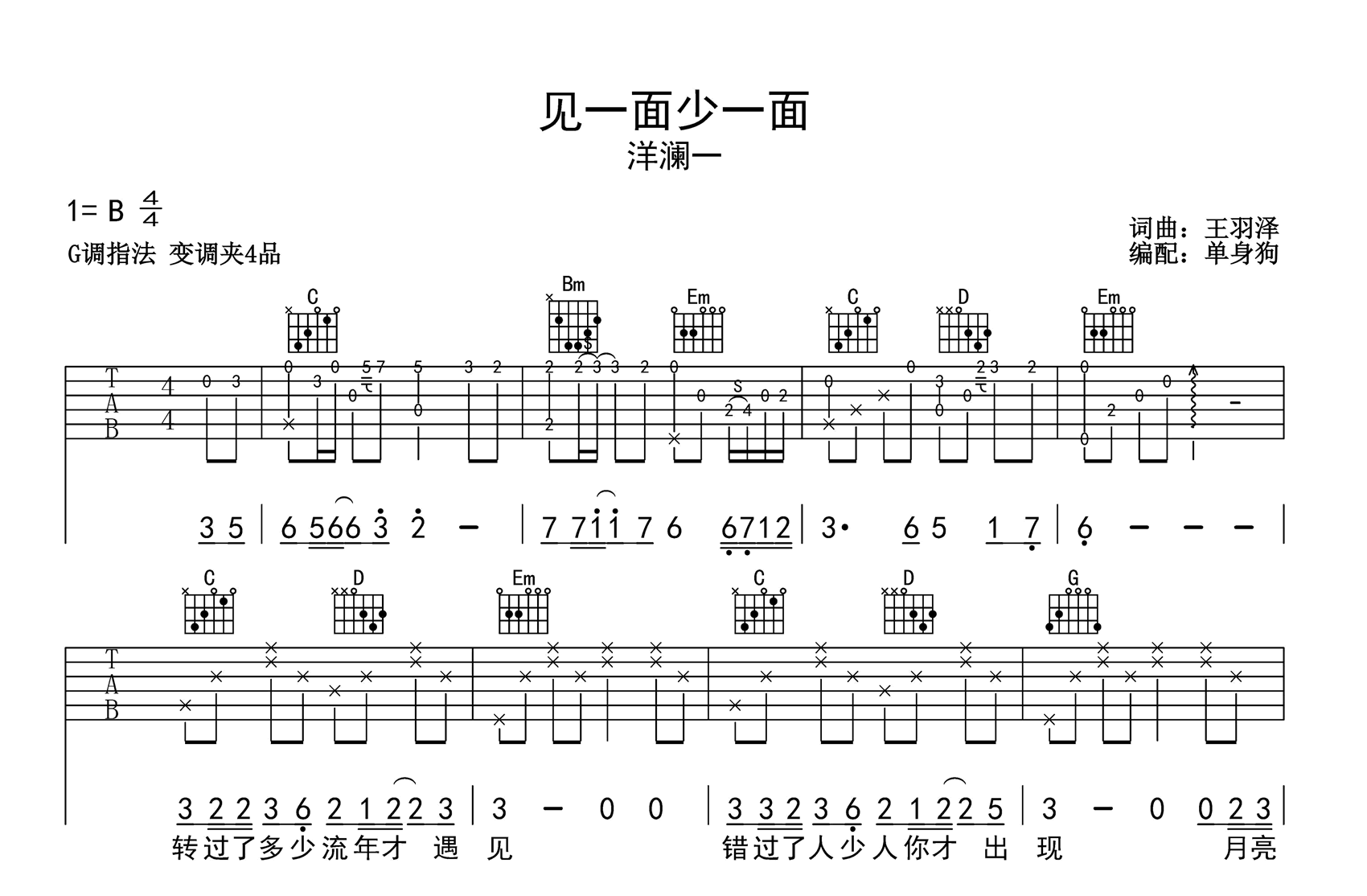 见一面少一面吉他谱,洋澜一演唱,表达了对亲人或爱人相聚时光的珍惜与无奈。《见一面少一面》吉他弹唱谱,选用G调指法编配,变调4品,六线谱完整版共两张图片。