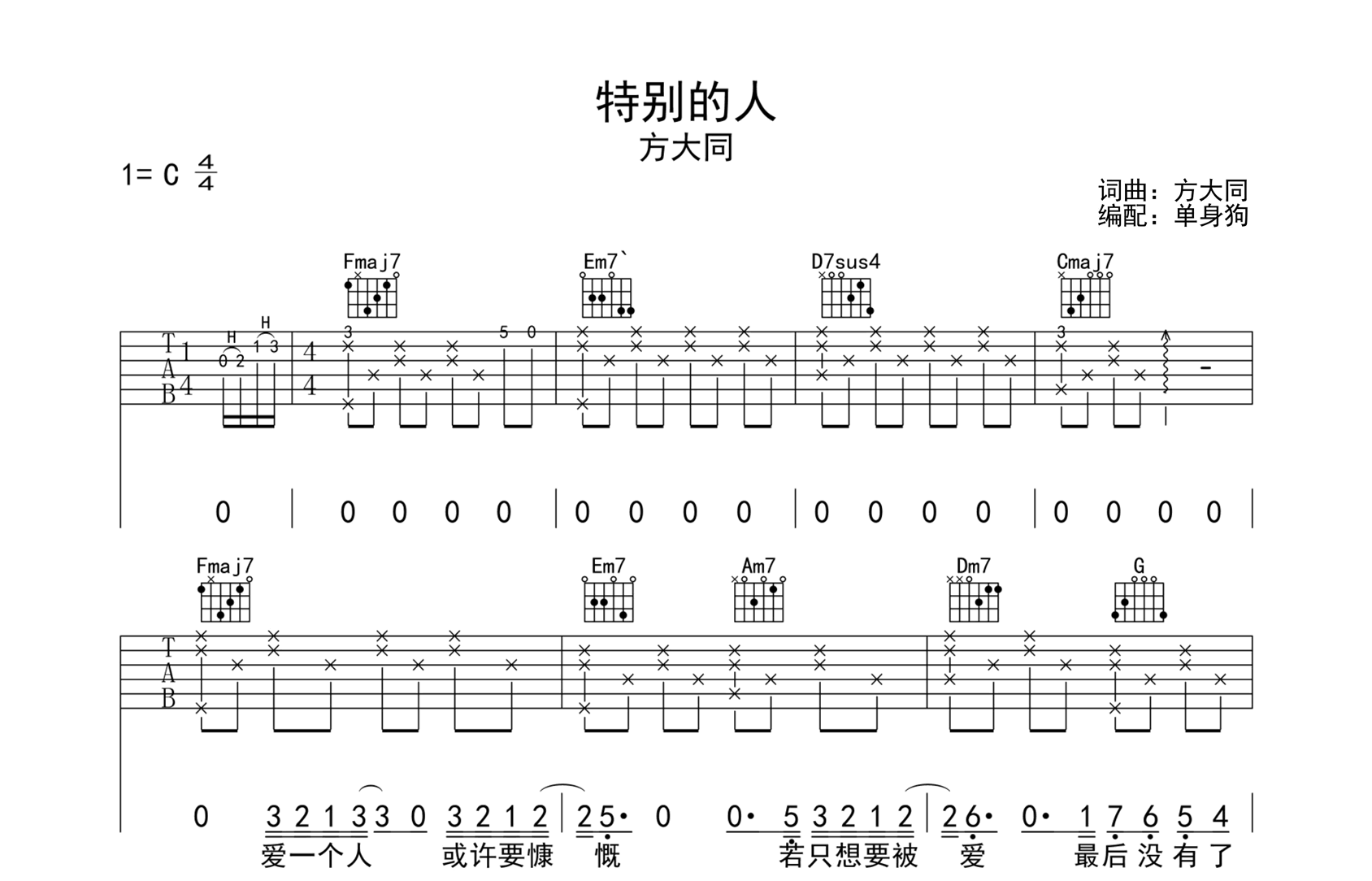 特别的人吉他谱,方大同演唱,传递出一份独特情感的珍惜与守护。《特别的人》吉他弹唱谱,选用C调指法编配,完整版共三张高清图片六线谱。