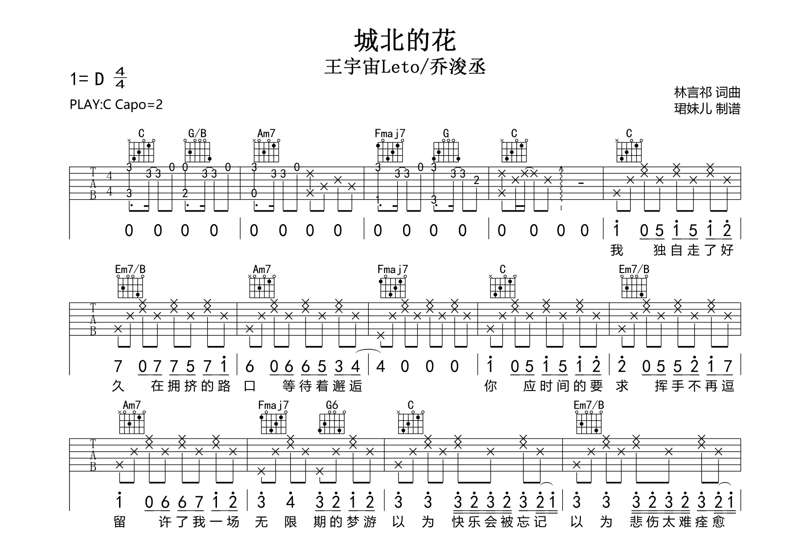 城北的花吉他谱,王宇宙Leto/乔浚丞唱出了对远方之人的深深牵挂与思念。《城北的花》吉他六线谱,选用G调指法进行编配,变调夹Capo3品,完整版共两张高清图片六线谱。