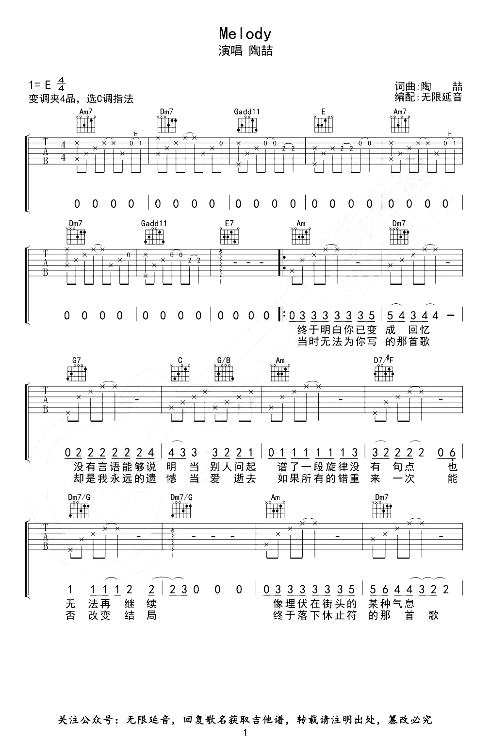 《Melody》吉他弹唱谱,原调E,变调夹夹第四品,选用C调指法,带前奏间奏完整编配共四张图片六线谱。