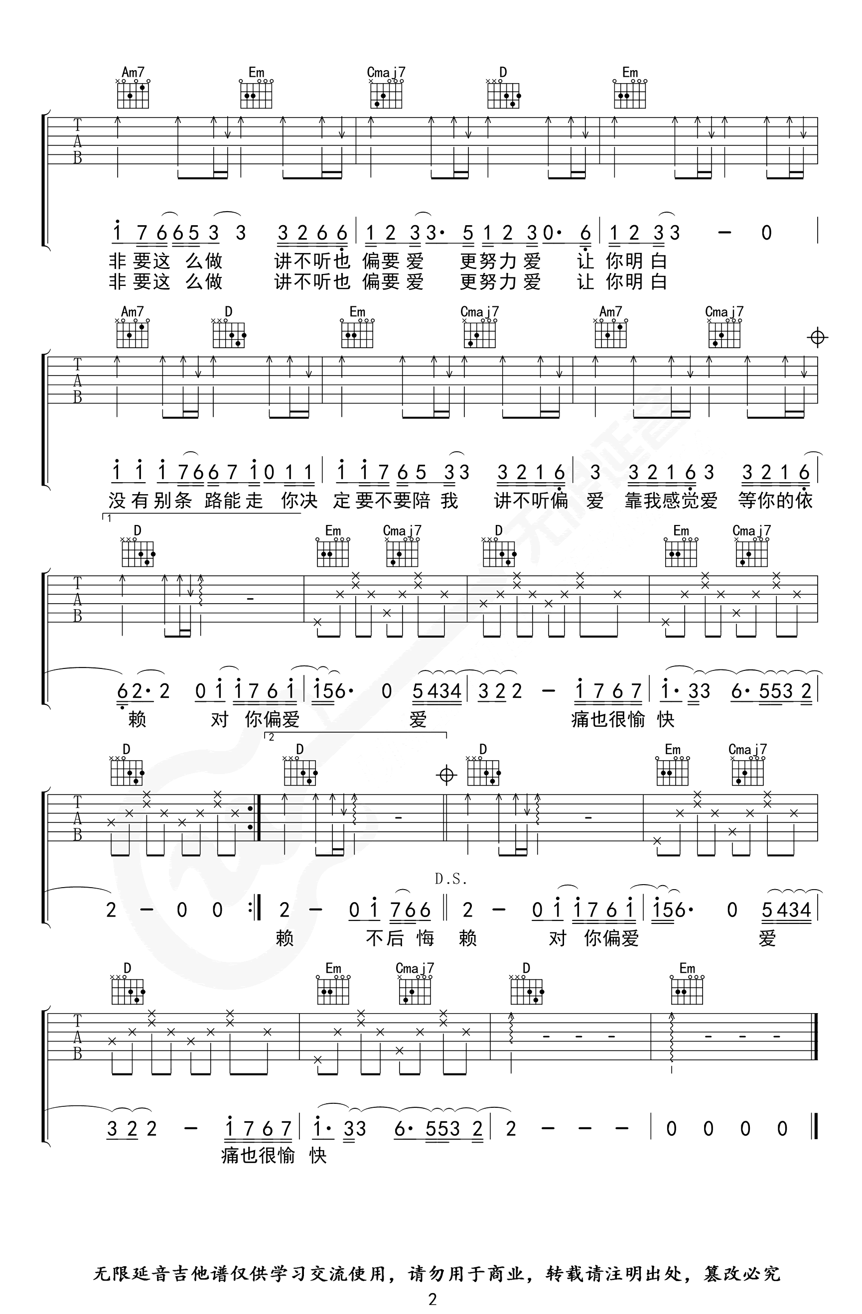 《偏爱》吉他弹唱谱,原调A,变调夹夹二品,选用G调指法,两张高清图片六线谱。