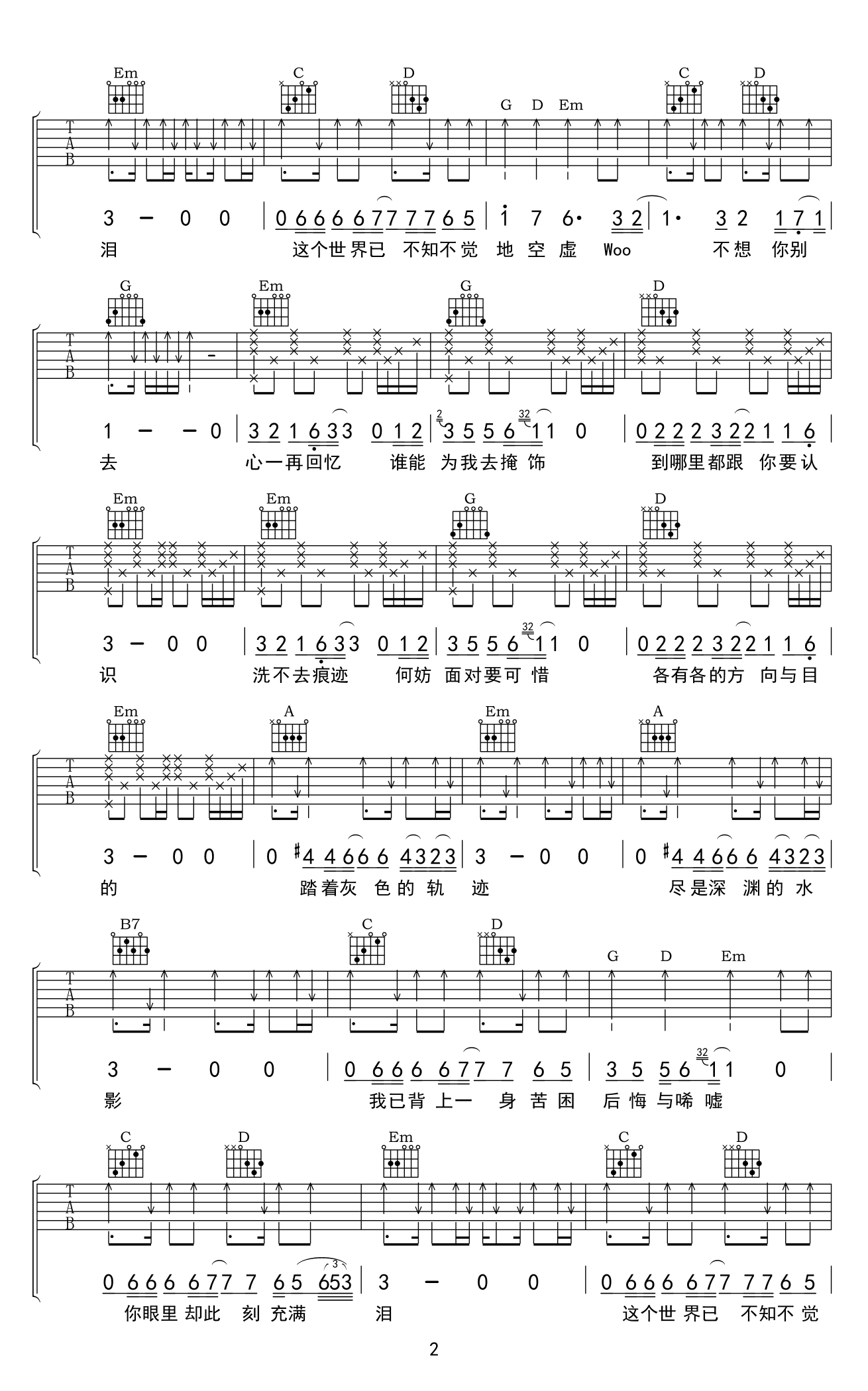 《灰色轨迹》吉他弹唱谱,原调A选调G,变调夹夹第二品,完整版共四张图片六线谱。